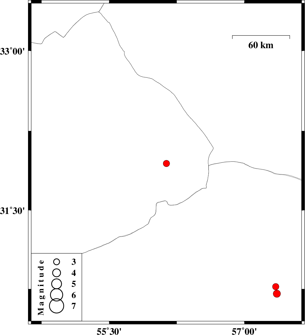 | 2017/11/06 | 21:55:14.1 | 01:25:14.1 | 30.773 | 57.348 | 6 | ML:3.3 | Kerman Province, 60 km North-East of Kerman | ||