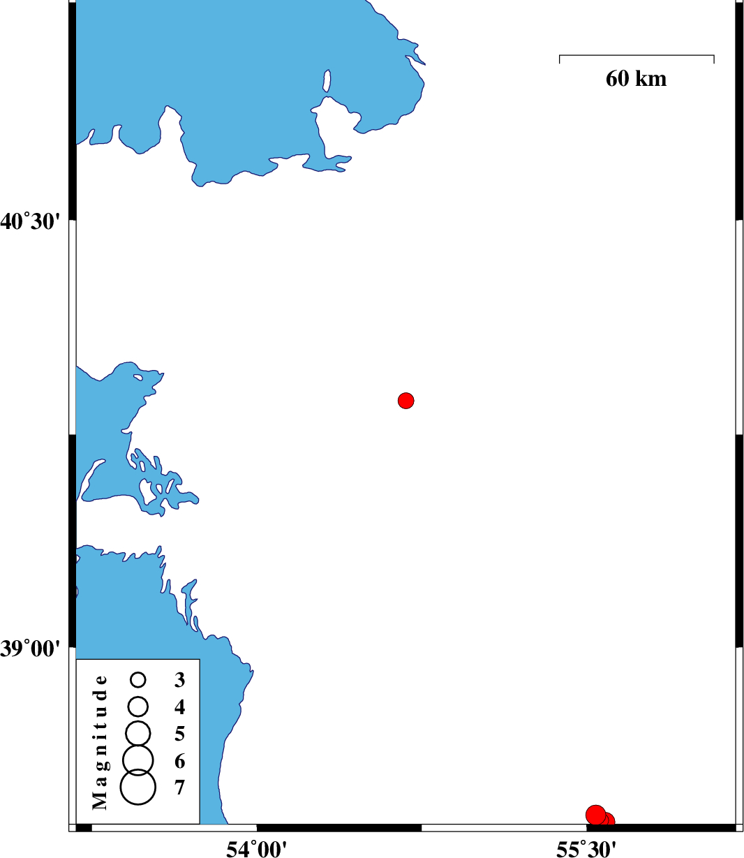 | 2017/03/19 | 06:59:55.6 | 10:29:55.6 | 39.869 | 54.678 | 16 | ML:3.2 | Turkmenistan | ||
