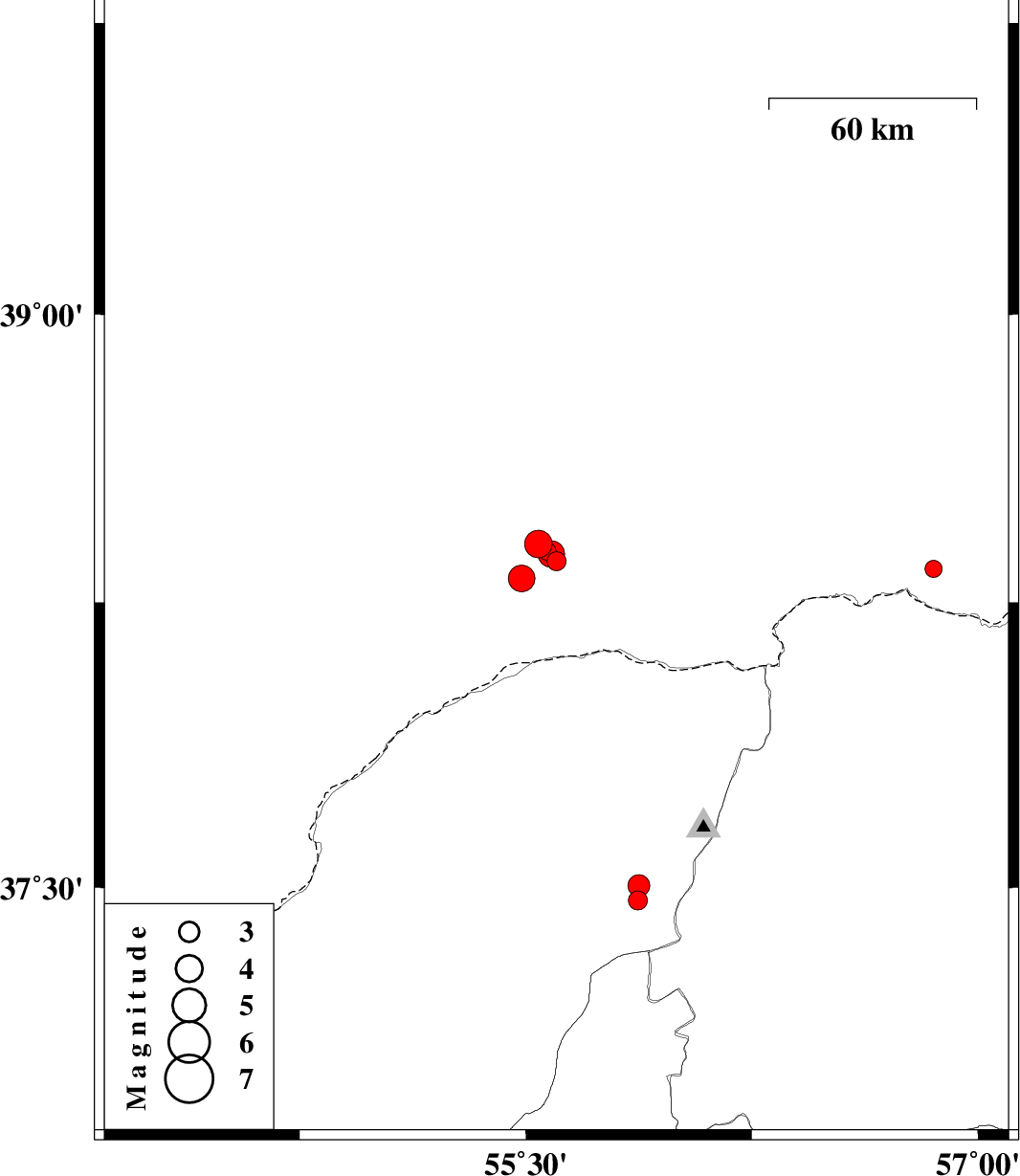 | 2017/03/16 | 00:48:25.7 | 04:18:25.7 | 37.505 | 55.876 | 16 | ML:3.2 | Golestan Province, 37 km North-East of Kalaleh | ||