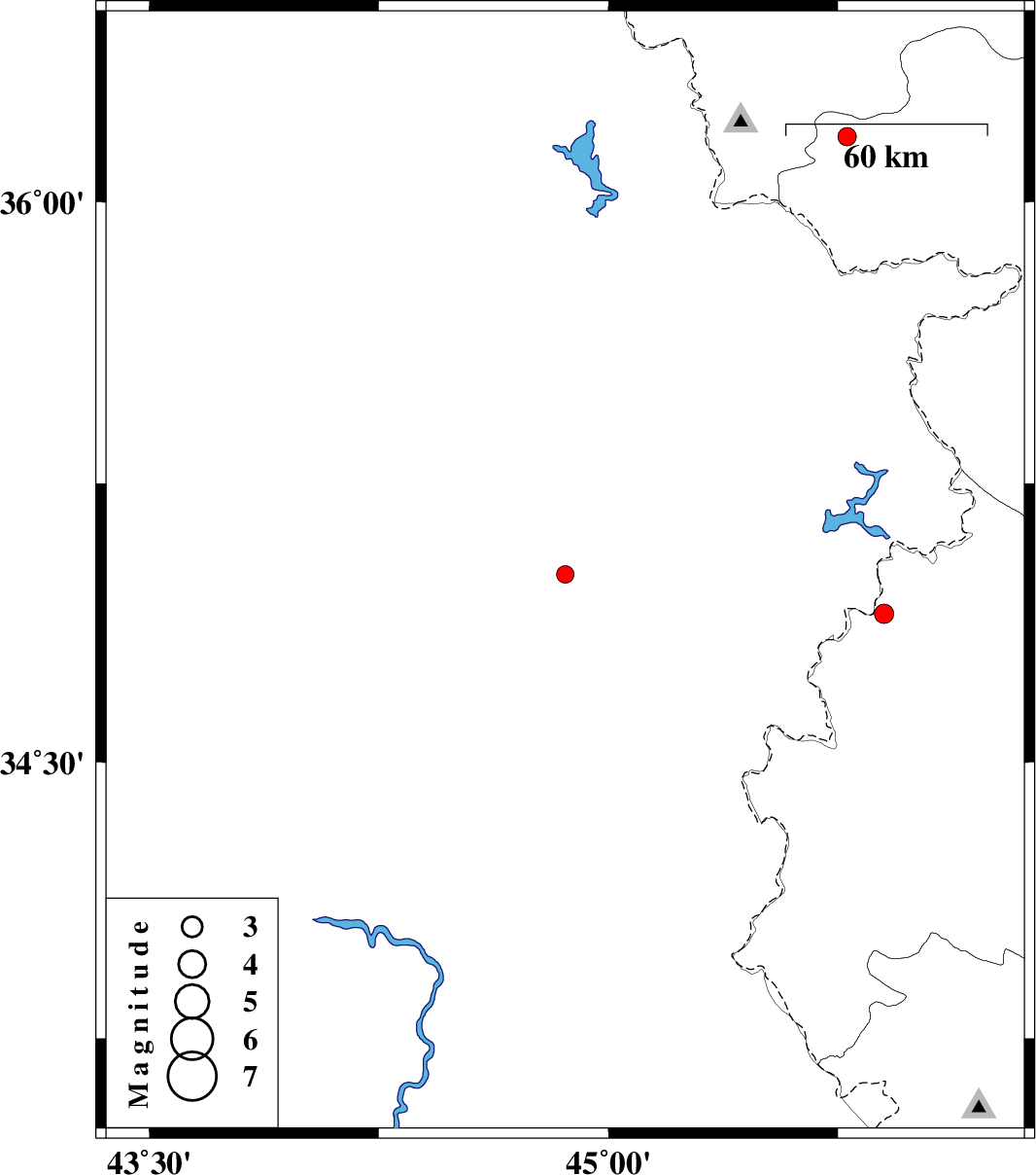 | 2017/11/07 | 13:59:20.2 | 17:29:20.2 | 35.006 | 44.859 | 14 | ML:2.6 | Iraq, 81 km South-West of Sulaymaniyah | ||