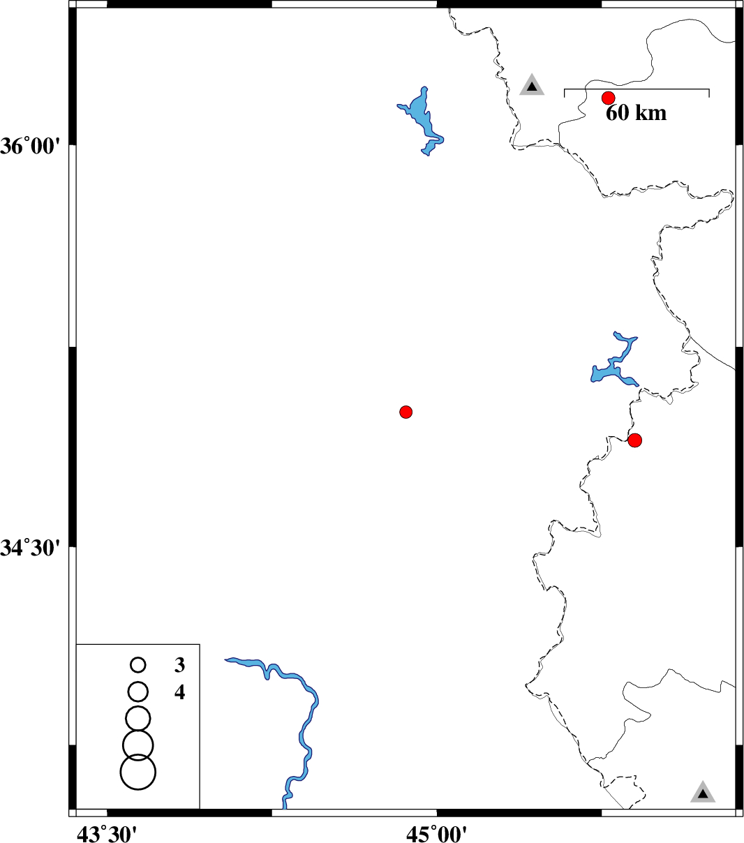 | 2017/10/08 | 19:26:37.5 | 22:56:37.5 | 34.9 | 45.9 | 14 | ML:2.8 | Kermanshah Province, 16 km North of Tazehabad |