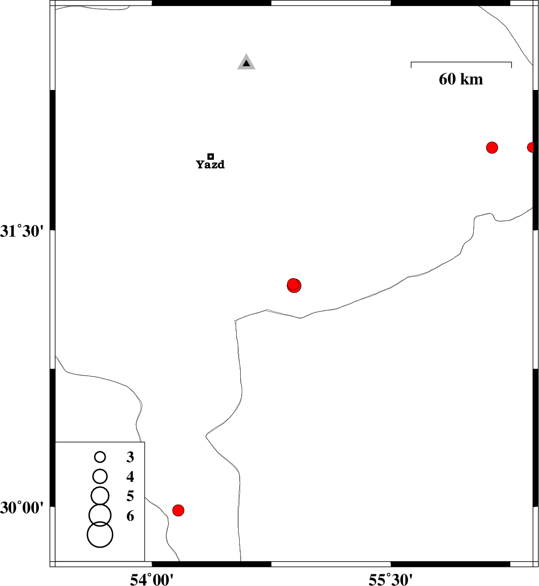 2017/11/07 | 06:39:59.5 | 10:09:59.5 | 31.943 | 56.135 | 14 | ML:3.3 | Yazd Province, 79 km North-East of Bafq | ||