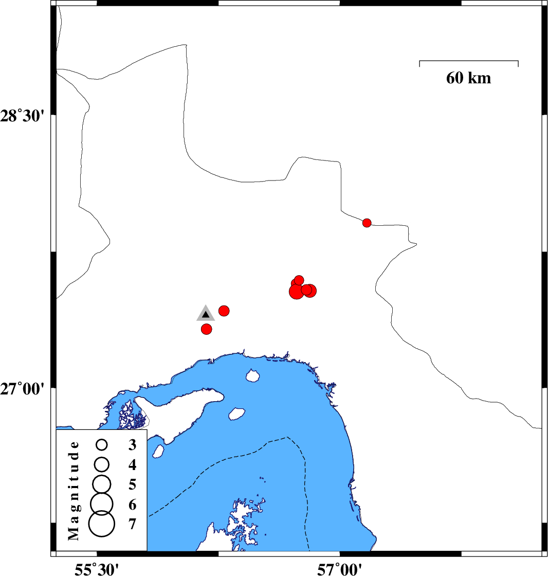 2017/11/11 13:23:15.7 16:53:15.7 27.59356.74714 ML:2.7 Hormozgan Province, 52 km North-West of Dehbarez
