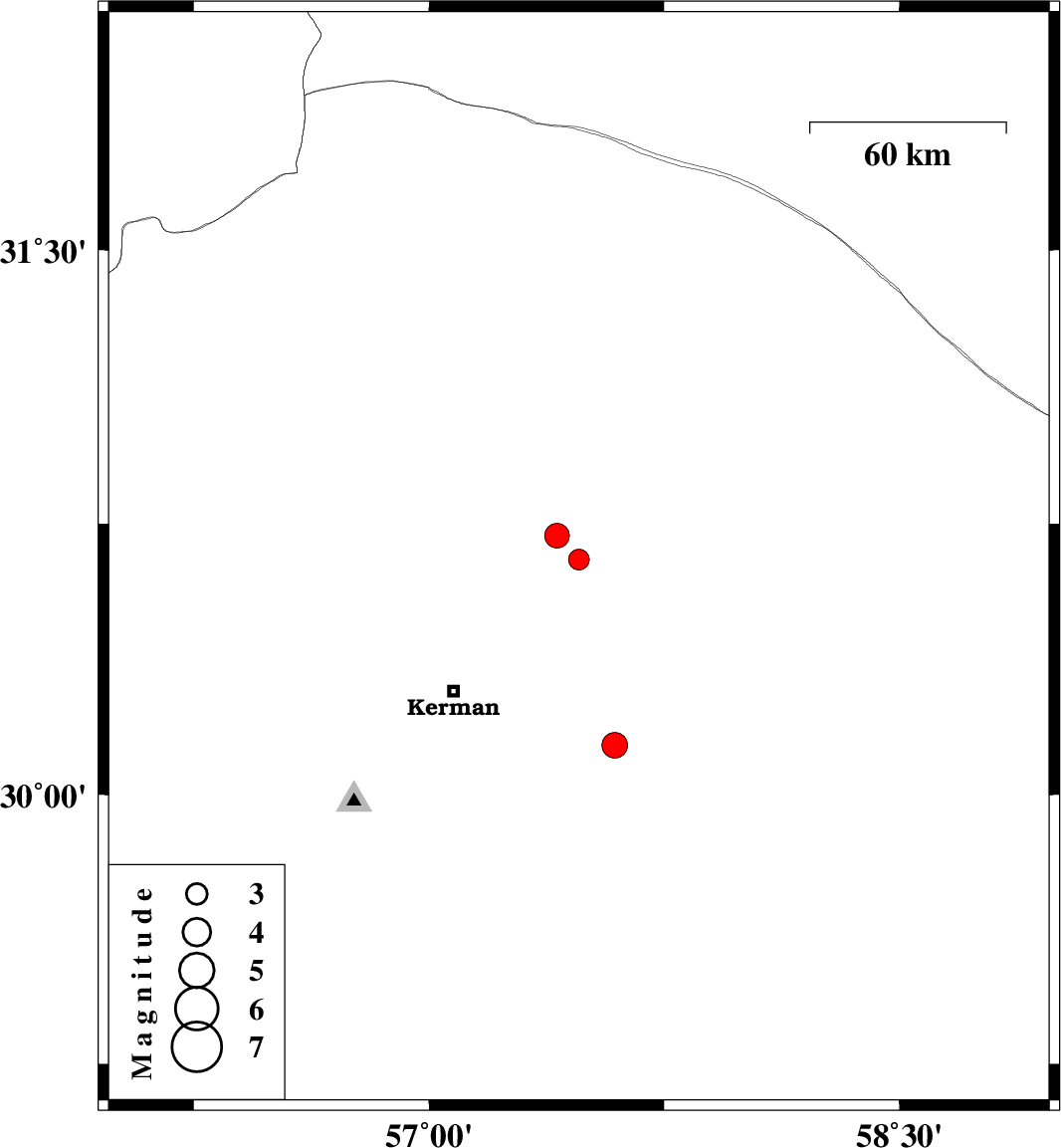 | 2017/11/18 | 07:28:38.4 | 10:58:38.4 | 30.137 | 57.592 | 15 | ML:3.6 | Kerman Province, 52 km South-East of Kerman | ||