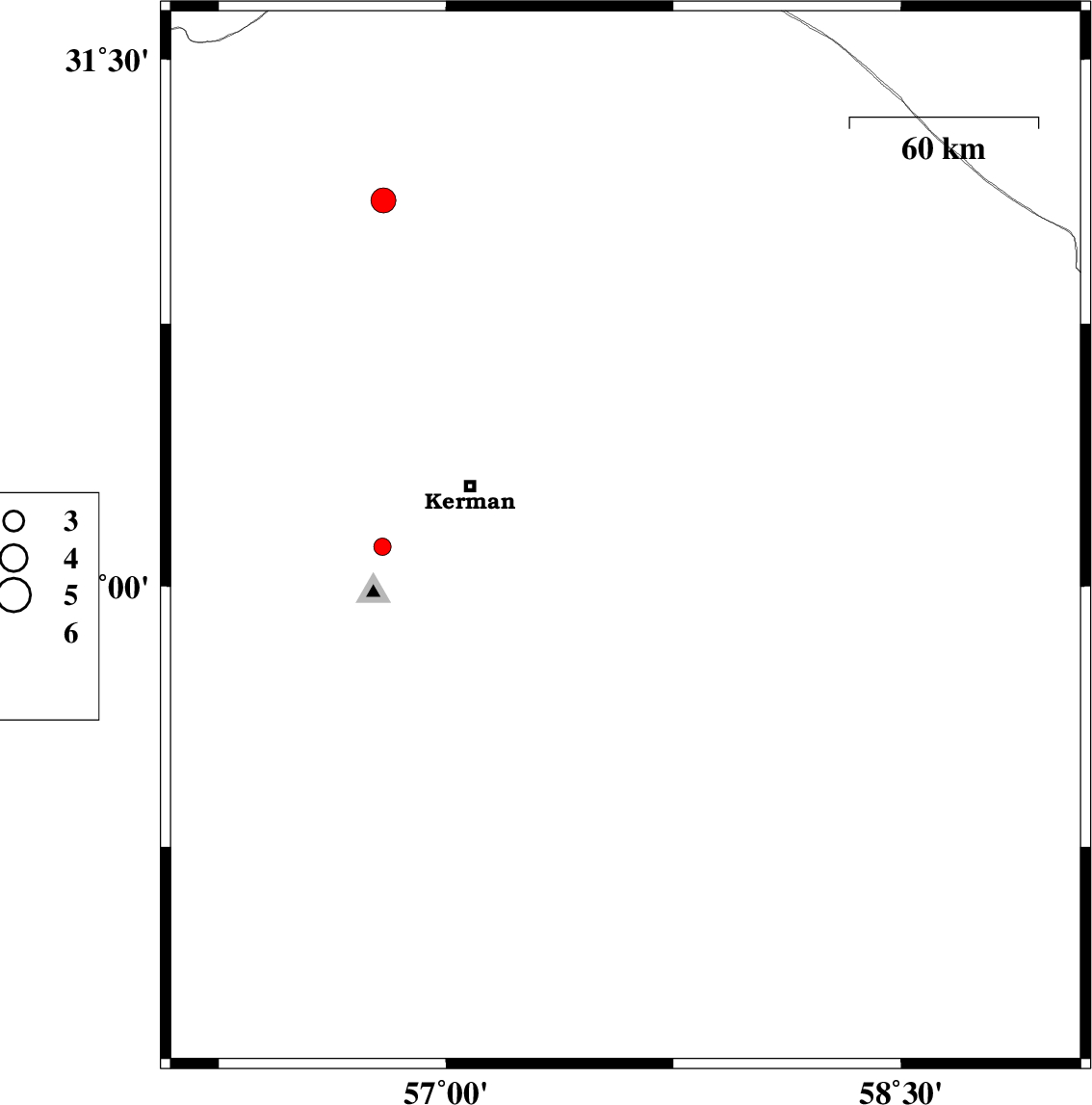 2017/11/18 | 01:19:39.1 | 04:49:39.1 | 30.65 | 57.478 | 6 | ML:3 | Kerman Province, 56 km North-East of Kerman | ||
