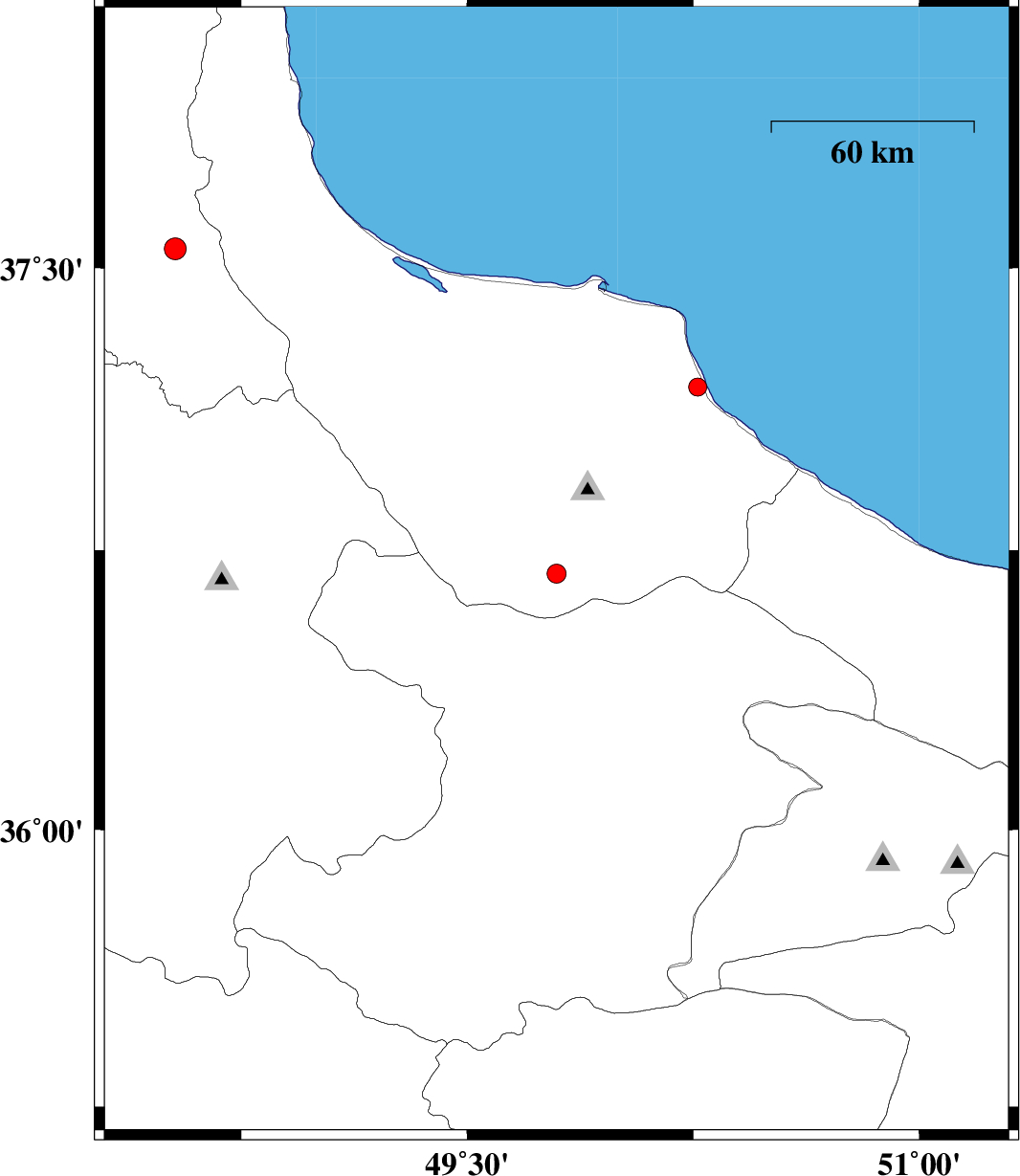 | 2017/11/25 | 00:14:52.9 | 03:44:52.9 | 36.687 | 49.796 | 15 | ML:2.8 | Gilan Province, 36 km South-East of Rudbar | ||