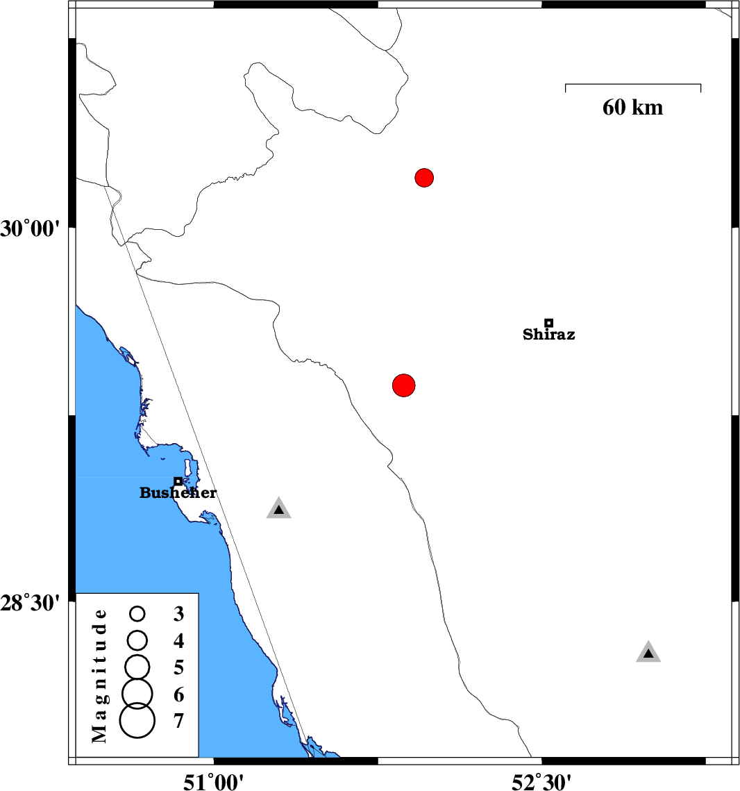 | 2017/12/30 | 20:53:23.4 | 00:23:23.4 | 29.369 | 51.868 | 15 | ML:4.6 | Fars Province, 35 km South-East of Kazerun | ||