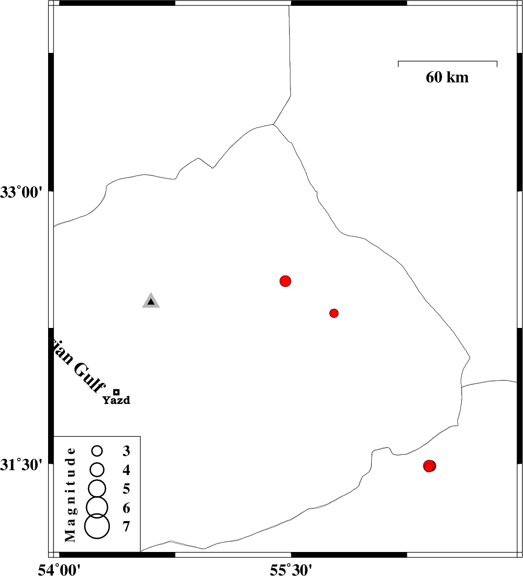 | 2018/01/22 | 10:57:27.1 | 14:27:27.1 | 32.507 | 55.462 | 15 | ML:3.3 | Yazd Province, 101 km North of Bafq | ||