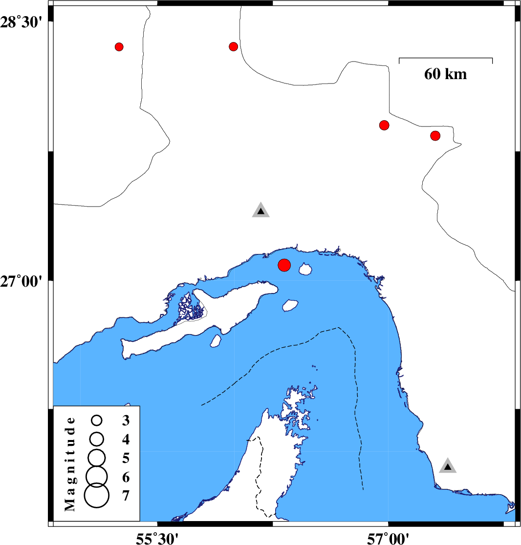 | 2018/02/19 | 02:24:25.5 | 05:54:25.5 | 27.089 | 56.324 | 11 | ML:3.6 | Persian Gulf, 11 km of Bandar-e abbas | ||