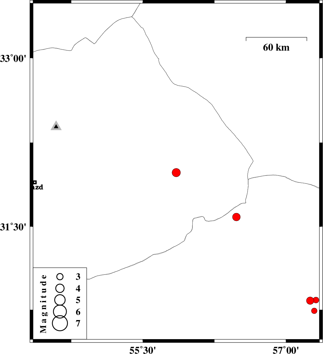 | 2018/03/04 | 17:48:40.8 | 21:18:40.8 | 31.982 | 55.85 | 15 | ML:3.9 | Yazd Province, 60 km North-East of Bafq | ||