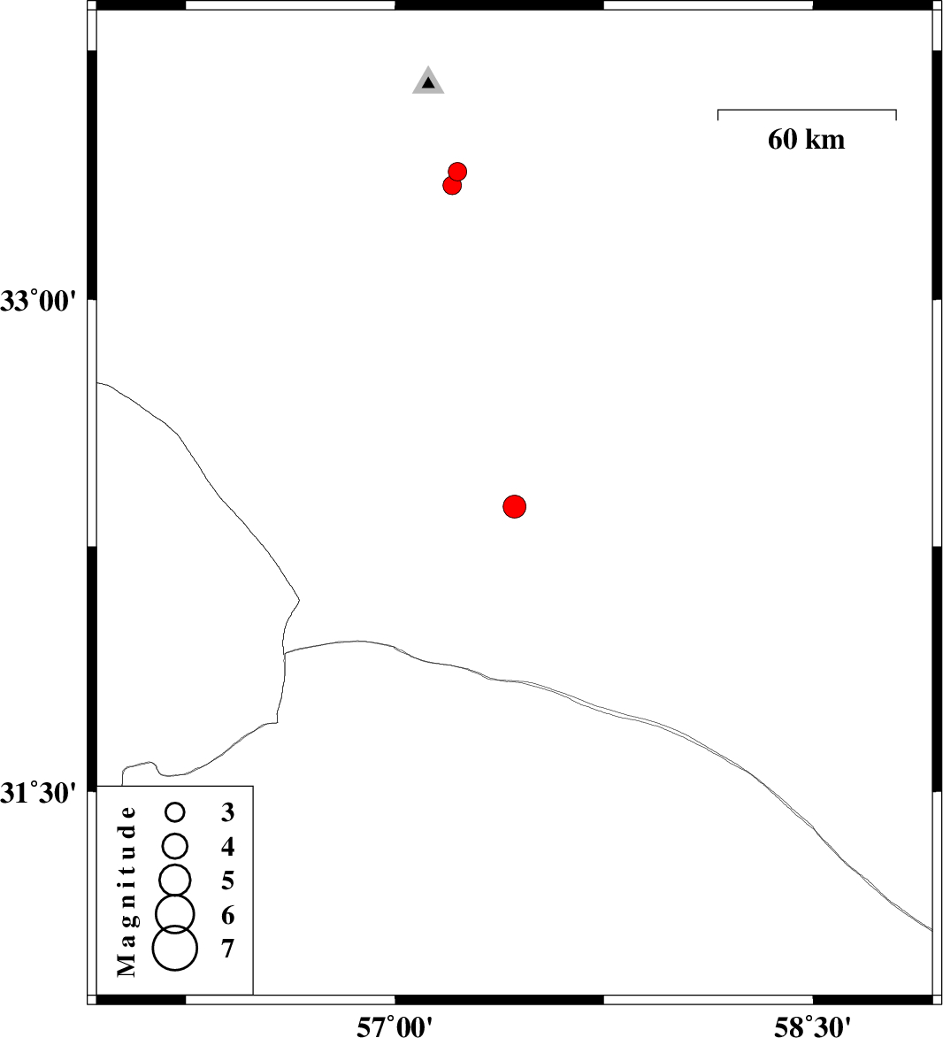 | 2018/03/11 | 00:02:51.0 | 03:32:51.0 | 33.344 | 57.205 | 8 | ML:2.9 | Yazd Province, 38 km South-East of Tabas |