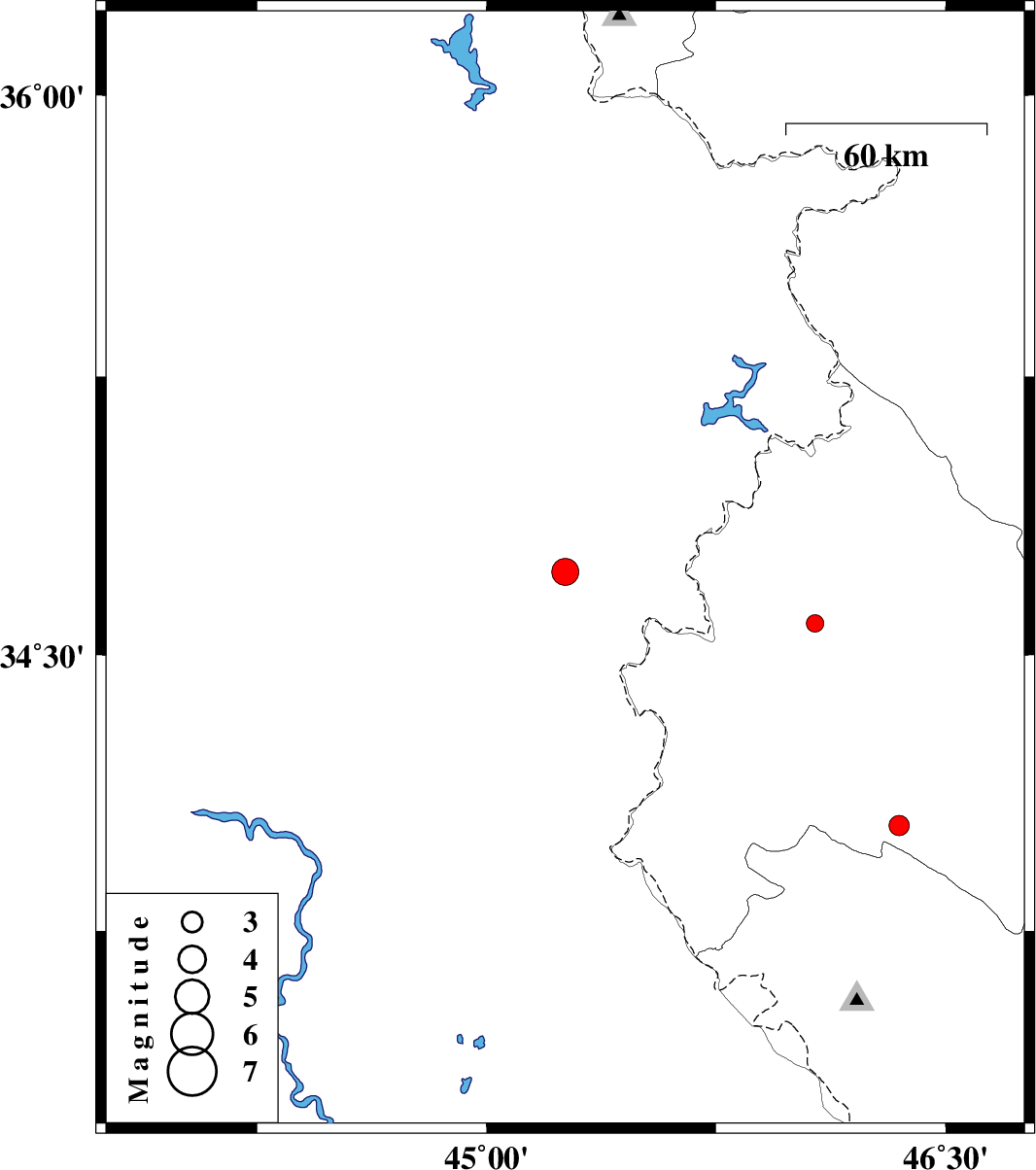 | 2018/03/16 | 15:58:49.3 | 19:28:49.3 | 34.038 | 46.348 | 14 | ML:2.9 | Kermanshah Province, 24 km North of Eyvan |
