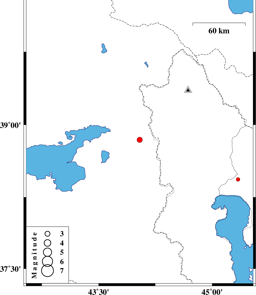 | 2018/04/06 | 19:14:13.5 | 23:44:13.5 | 38.845 | 44.043 | 14 | ML:3.2 | Turkey, 40 km South-West of Seyah Cheshmah | ||