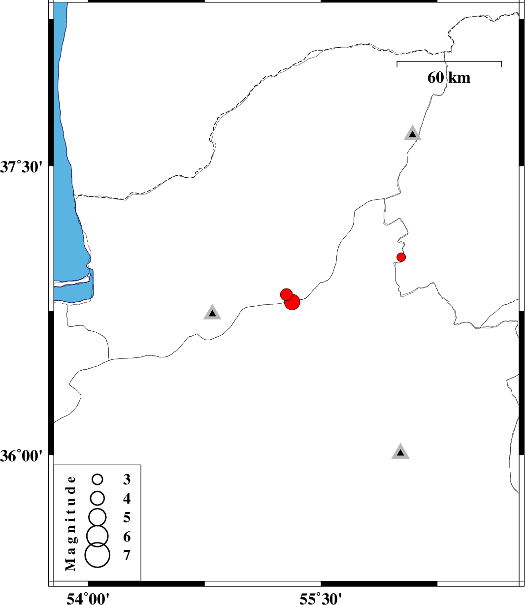 2018/03/12 | 07:02:43.3 | 10:32:43.3 | 37.03 | 56.017 | 15 | ML:2.6 | Semnan Province, 34 km -West of Jajarm |