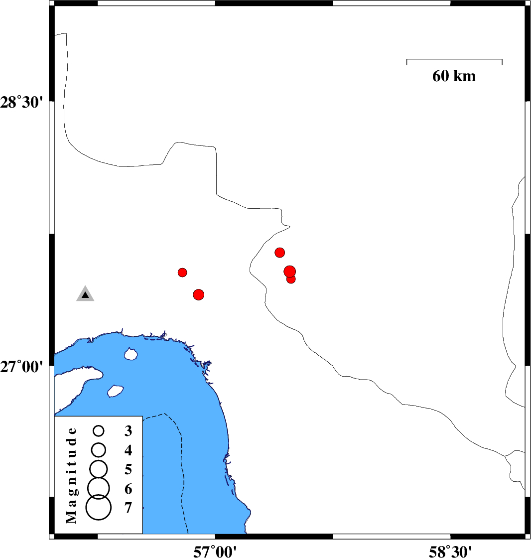 | 2018/04/05 | 04:24:37.3 | 08:54:37.3 | 27.53 | 56.79 | 11 | ML:2.6 | Hormozgan Province, 46 km North-West of Dehbarez |