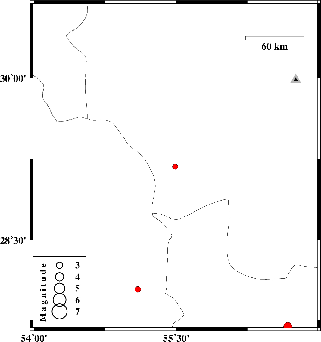 | 2018/04/16 | 01:54:18.7 | 06:24:18.7 | 28.039 | 55.095 | 14 | ML:2.8 | Fars Province, 85 km South-West of Hajiabad |