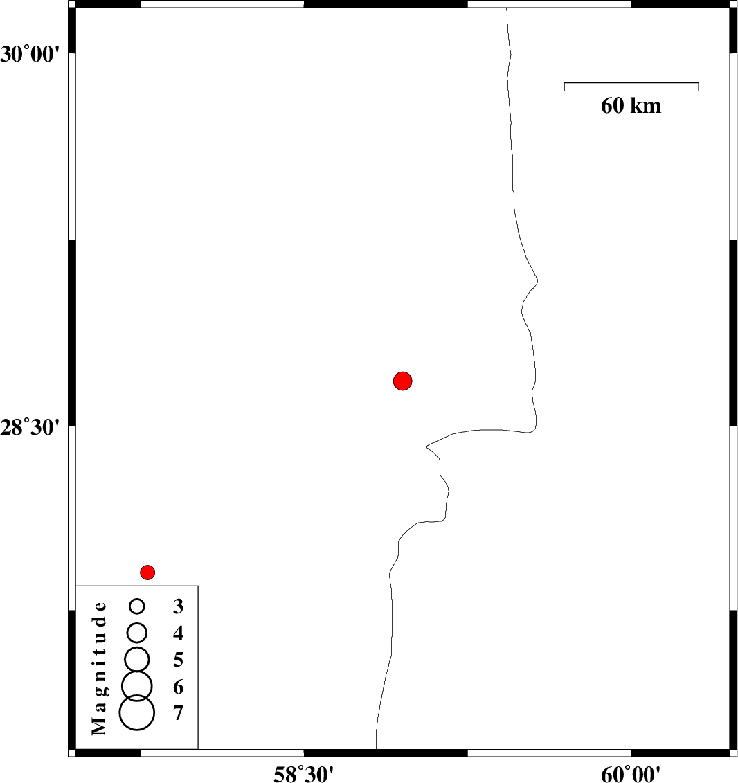 2018/05/06 | 08:09:14.8 | 12:39:14.8 | 28.681 | 58.952 | 15 | ML:3.8 | Kerman Province, 75 km South-East of Bam | ||