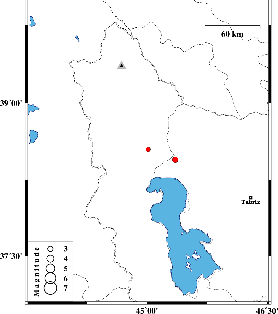 | 2018/04/30 | 05:49:59.2 | 10:19:59.2 | 38.446 | 45.351 | 14 | ML:3.2 | Azarbaijan Sharghi Province, 36 km -West of Marand |