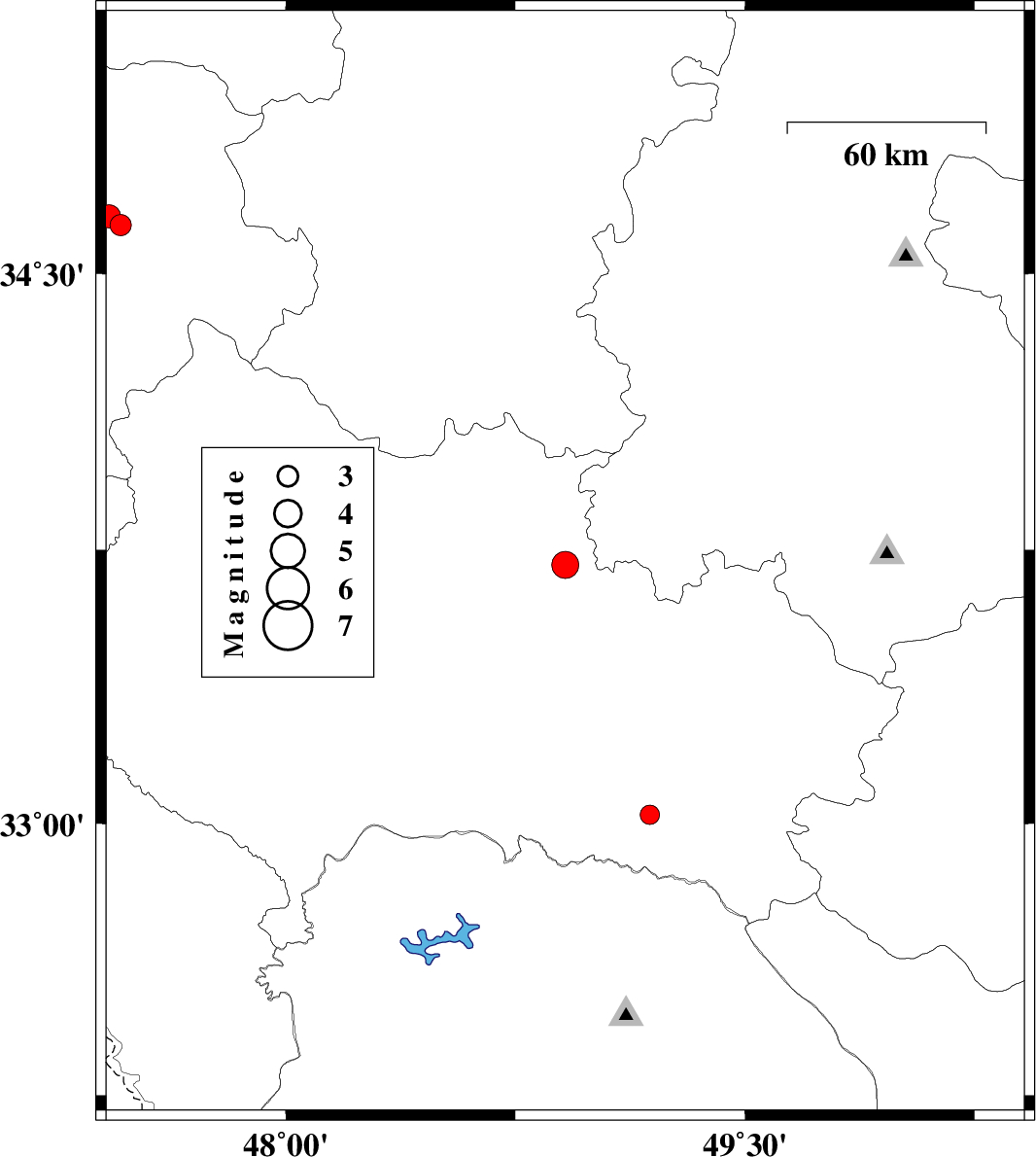 | 2018/05/07 | 14:18:25.9 | 18:48:25.9 | 33.709 | 48.913 | 15 | ML:3.9 | Lorestan Province, 25 km South-East of Borujerd | ||