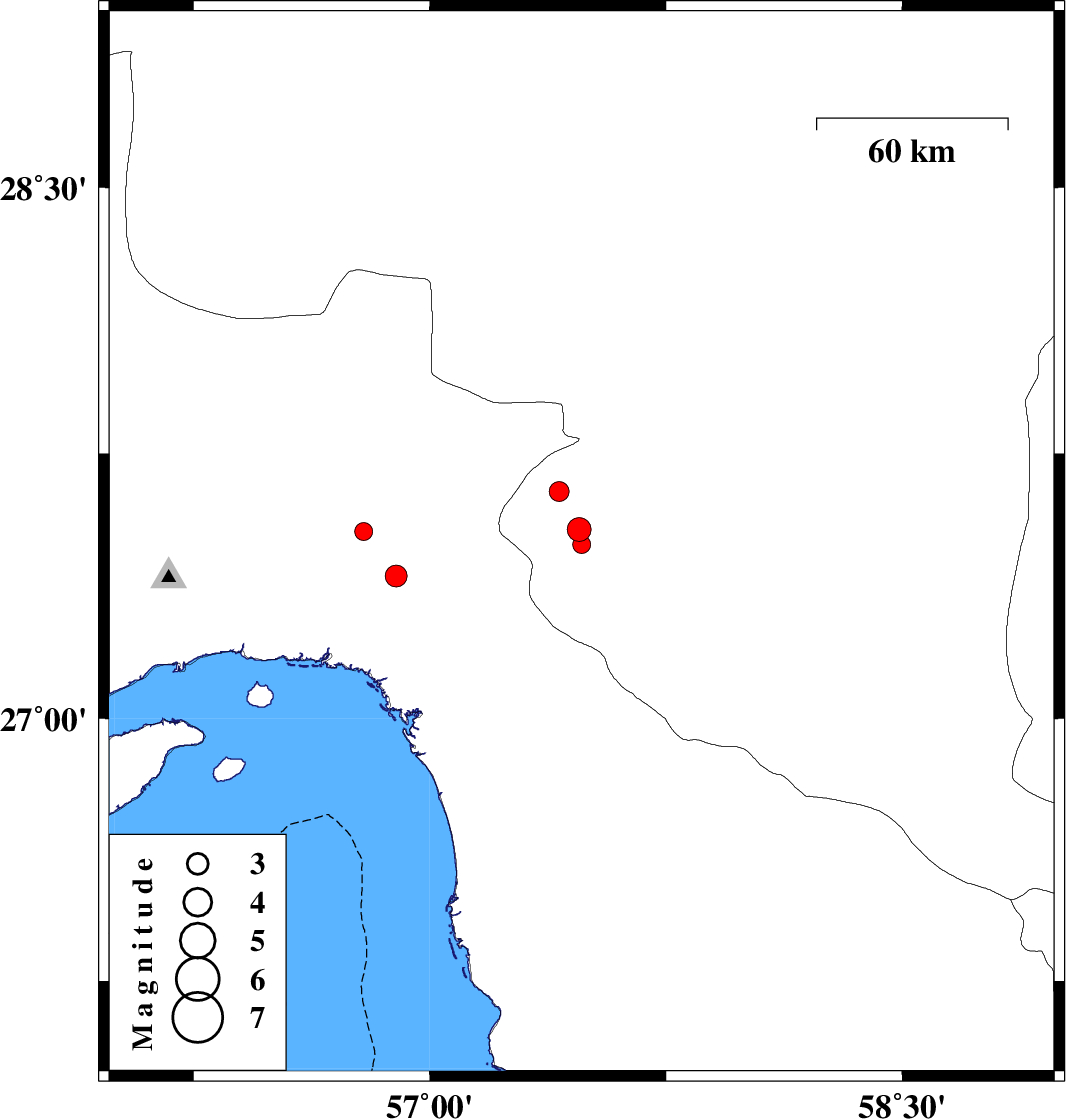 | 2018/04/05 | 04:24:37.3 | 08:54:37.3 | 27.53 | 56.79 | 11 | ML:2.6 | Hormozgan Province, 46 km North-West of Dehbarez |