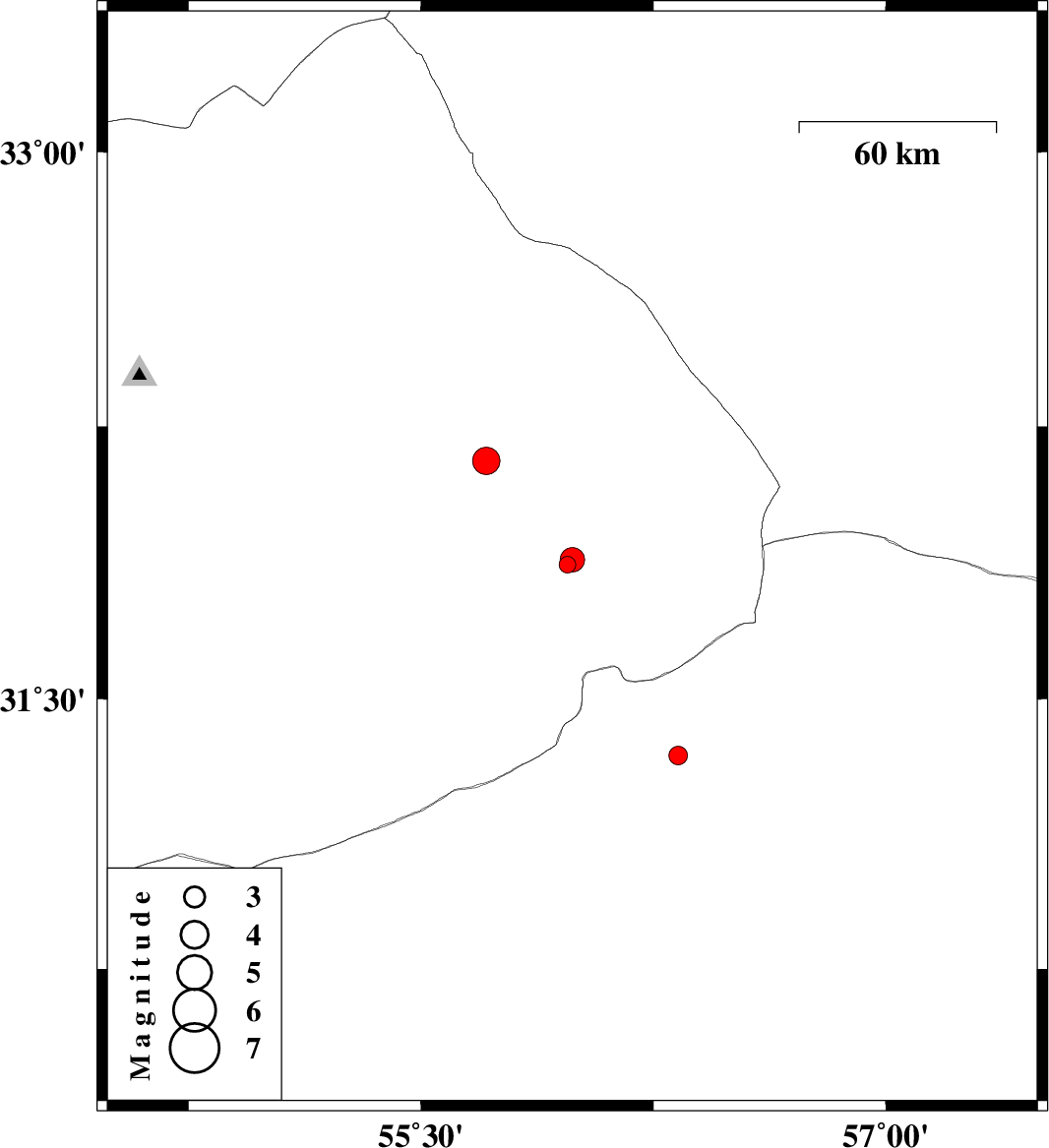 | 2018/05/15 | 00:47:04.2 | 05:17:04.2 | 31.883 | 55.988 | 14 | ML:3.5 | Yazd Province, 64 km North-East of Bafq | ||