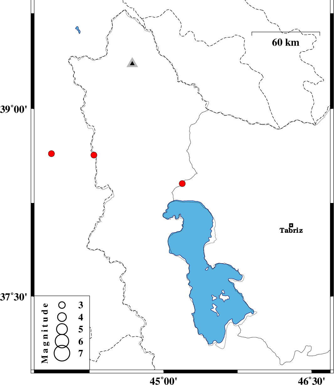 | 2018/05/20 | 00:02:23.5 | 04:32:23.5 | 38.405 | 45.189 | 14 | ML:2.8 | Azarbaijan Gharbi Province, 27 km South-East of Khoy | ||