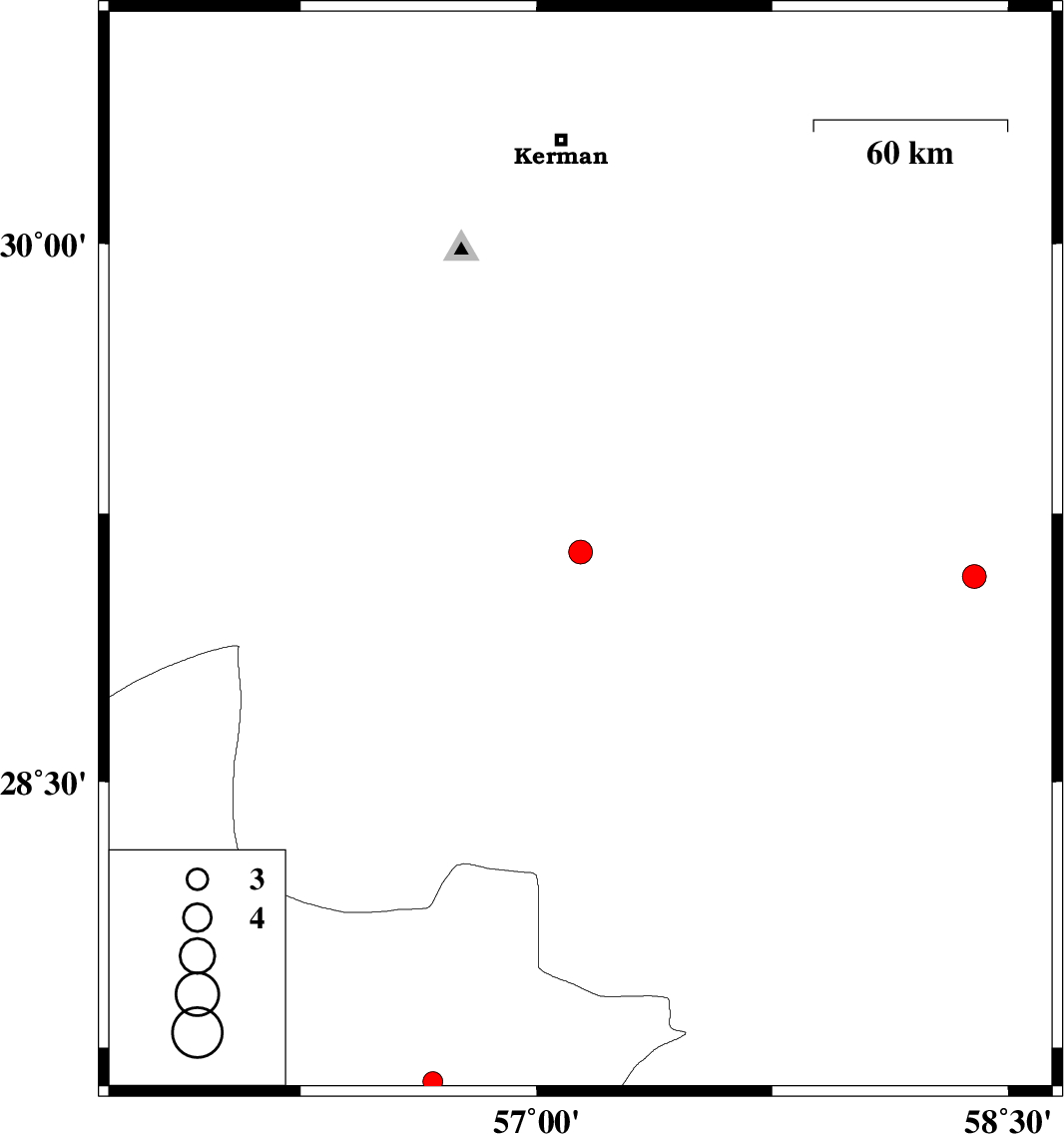 | 2018/03/26 | 03:21:01.8 | 07:51:01.8 | 29.074 | 58.393 | 14 | ML:3.4 | Kerman Province, 5 km of Bam |