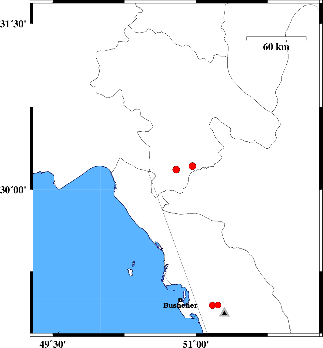 | 2018/05/20 | 14:49:54.1 | 19:19:54.1 | 28.938 | 51.173 | 14 | ML:3.1 | Bushehr Province, 11 km of Ahram | ||