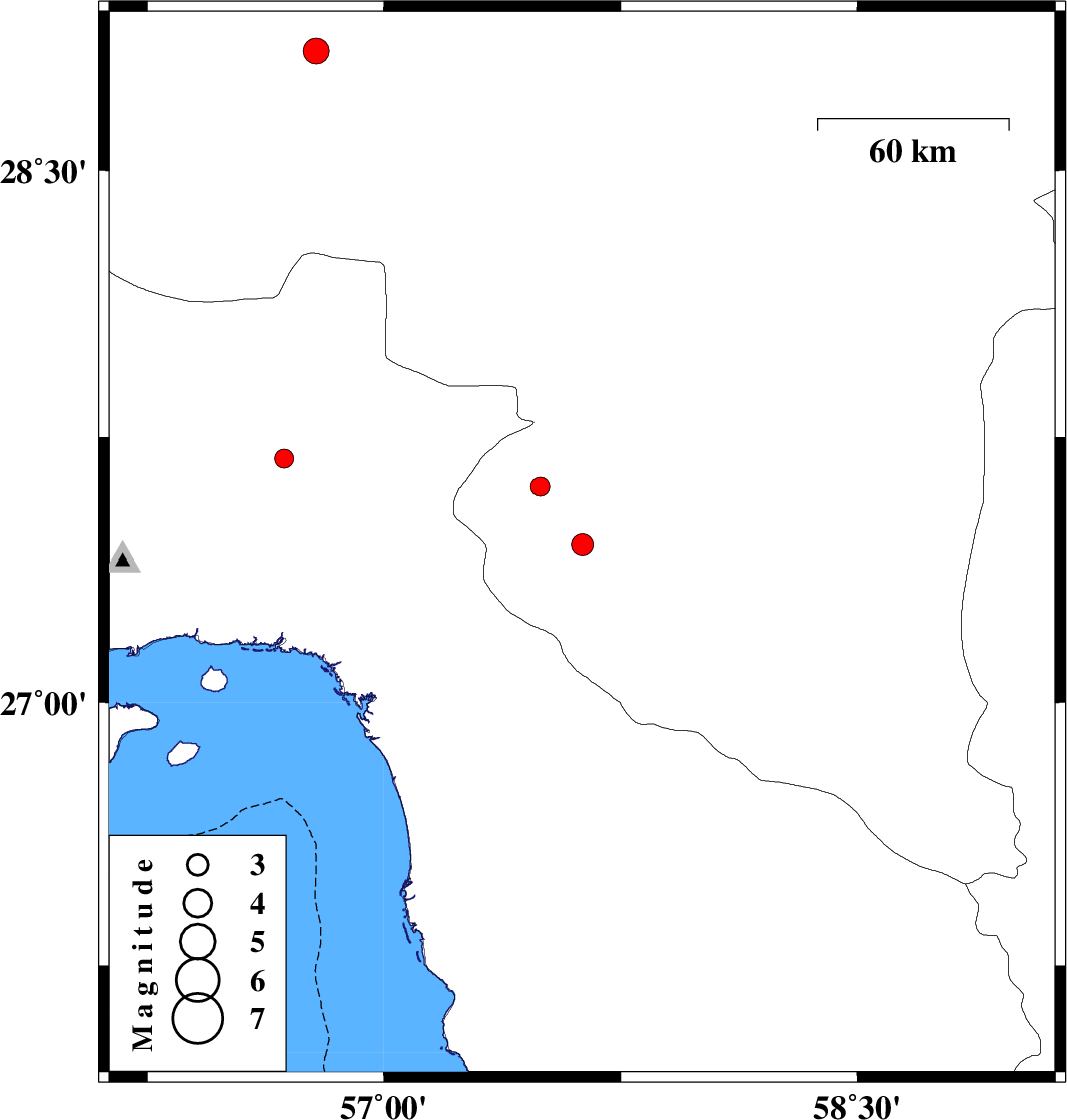 | 2018/05/28 | 16:18:05.5 | 20:48:05.5 | 27.446 | 57.628 | 18 | ML:3.1 | Kerman Province, 14 km -East of Manujan | ||