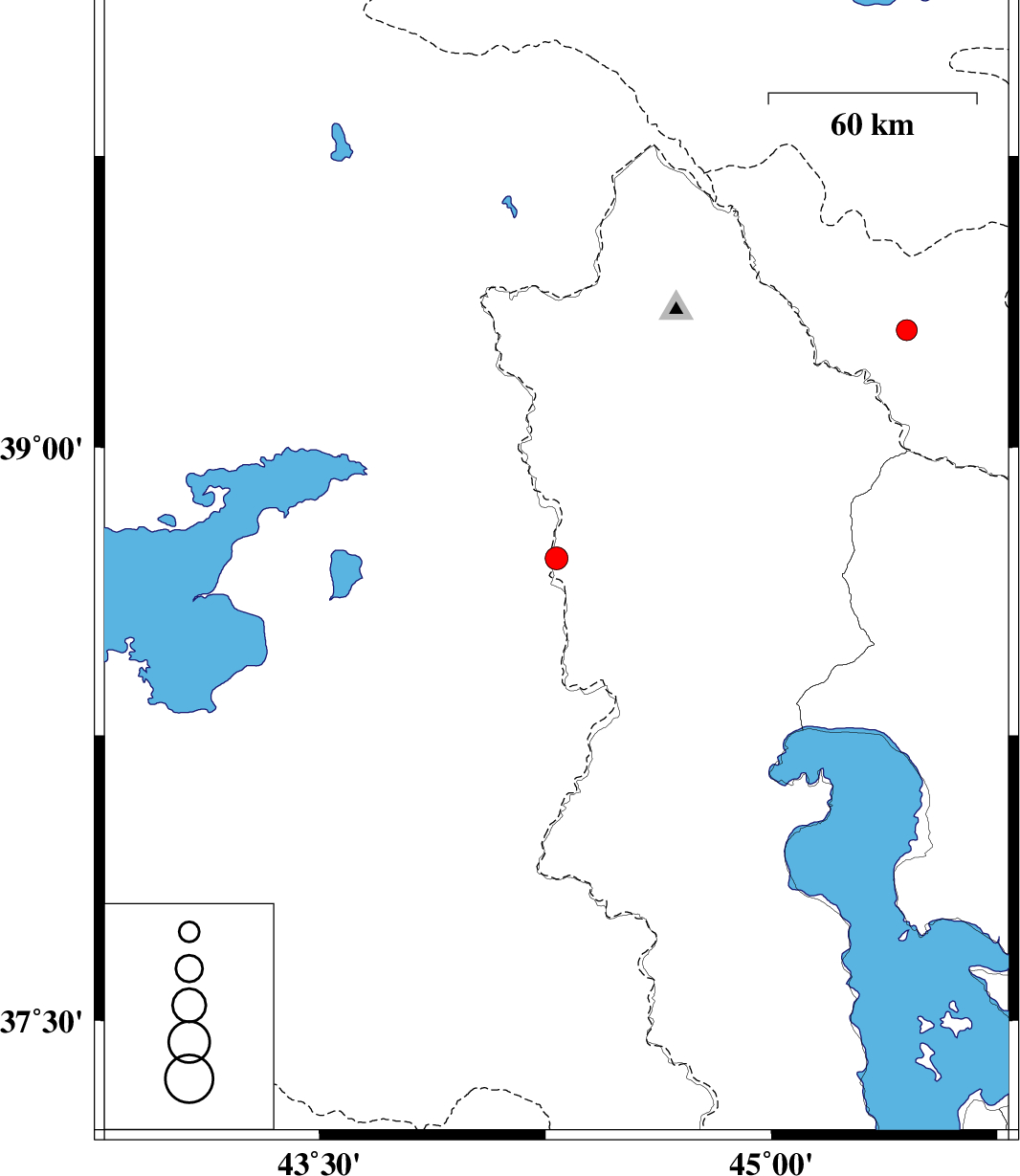 | 2018/05/29 | 03:48:28.5 | 08:18:28.5 | 38.711 | 44.287 | 14 | ML:3.4 | Azarbaijan Gharbi Province, 41 km South-West of Seyah Cheshmah | ||