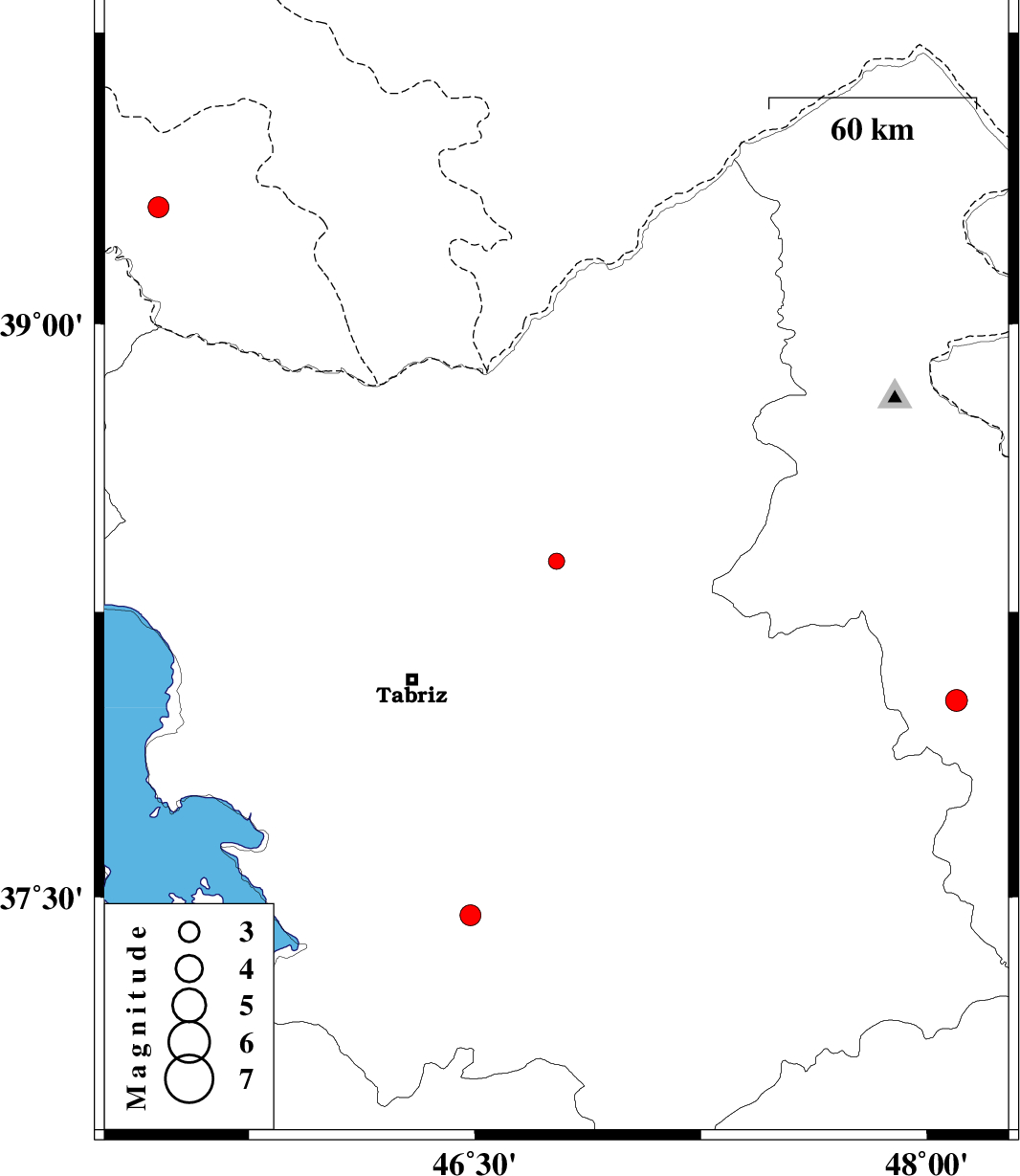 | 2018/06/02 | 06:30:07.2 | 11:00:07.2 | 38.383 | 46.771 | 14 | ML:2.4 | Azarbaijan Sharghi Province, 29 km -West of Ahar | ||