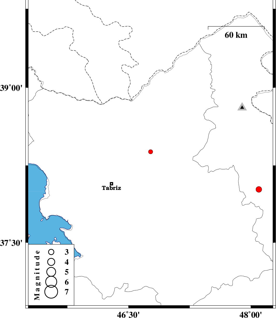 | 2018/06/02 | 06:30:07.2 | 11:00:07.2 | 38.383 | 46.771 | 14 | ML:2.4 | Azarbaijan Sharghi Province, 29 km -West of Ahar | ||