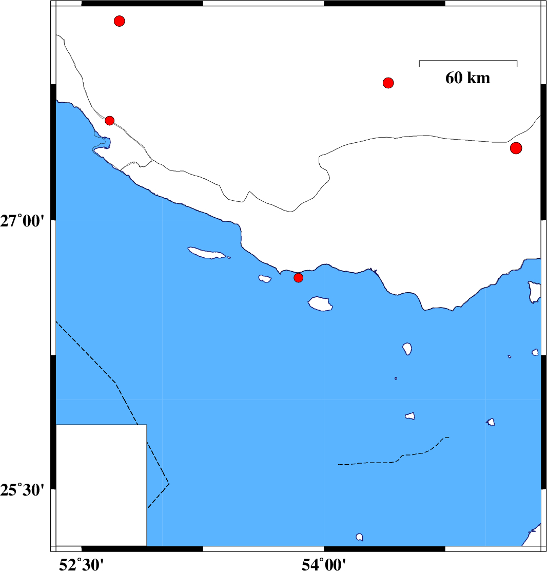 | 2018/06/02 | 19:37:34.6 | 00:07:34.6 | 26.68 | 53.841 | 14 | ML:2.5 | Persian Gulf, 77 km South-West of Bastak | ||