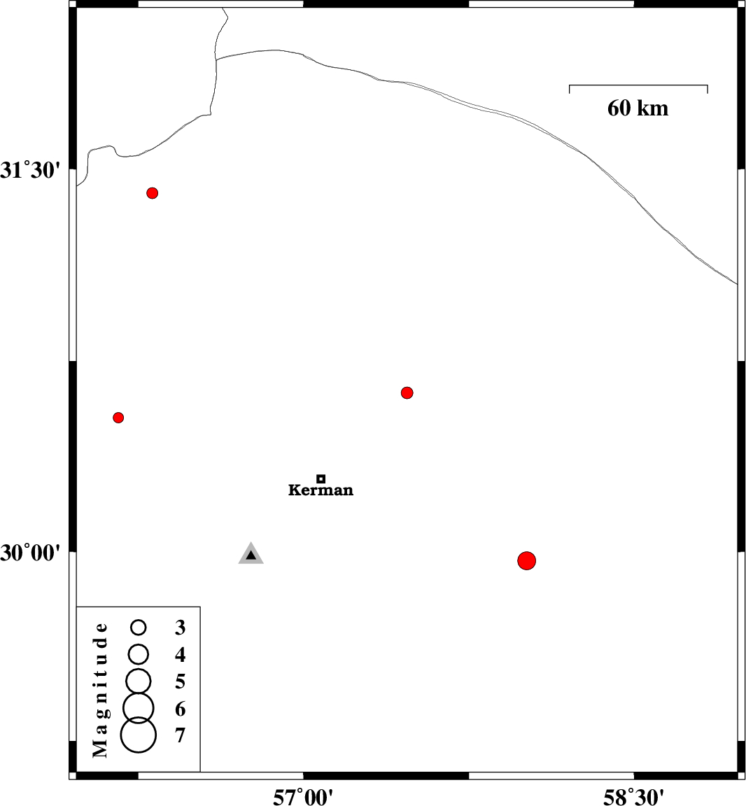 | 2018/06/11 | 09:58:01.1 | 14:28:01.1 | 30.626 | 57.469 | 14 | ML:2.4 | Kerman Province, 53 km North-East of Kerman | ||