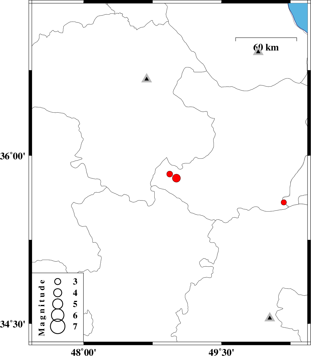 | 2018/06/17 | 04:19:47.8 | 08:49:47.8 | 35.835 | 48.936 | 15 | ML:2.9 | Ghazvin Province, 51 km North-West of Razan | ||