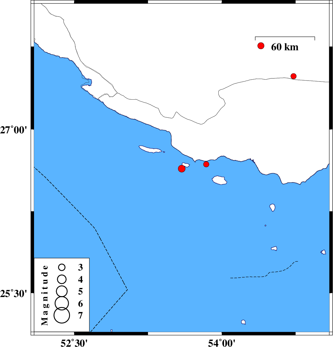 | 2018/06/17 | 19:54:03.2 | 00:24:03.2 | 26.64 | 53.592 | 16 | ML:3.2 | Persian Gulf, 88 km South-East of Lamerd | ||