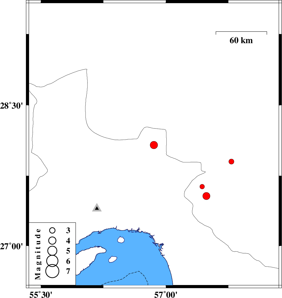 | 2018/06/27 | 23:46:33.9 | 04:16:33.9 | 27.533 | 57.487 | 15 | ML:4 | Kerman Province, 14 km North of Manujan |