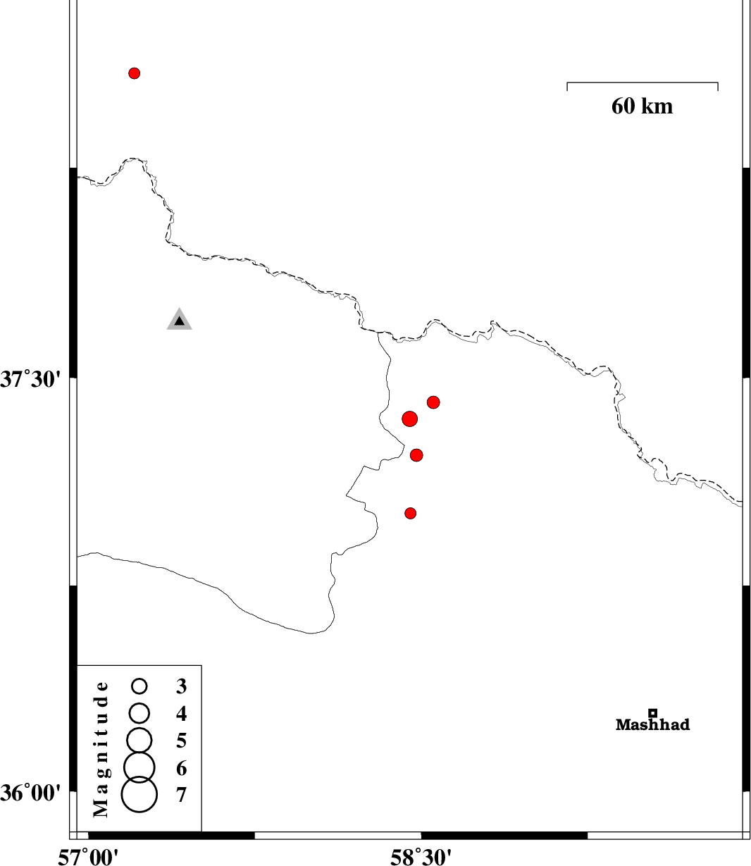 2018/06/26 | 01:16:42.7 | 05:46:42.7 | 37.412 | 58.554 | 14 | ML:2.5 | Khorasan(center) Province, 34 km North of Quchan | ||