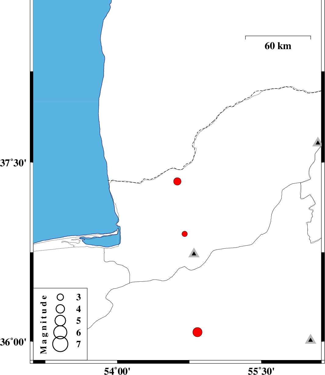 | 2018/07/11 | 04:29:59.2 | 08:59:59.2 | 37.341 | 54.625 | 14 | ML:3.5 | Golestan Province, 40 km North-East of Aq Qaleh | ||
