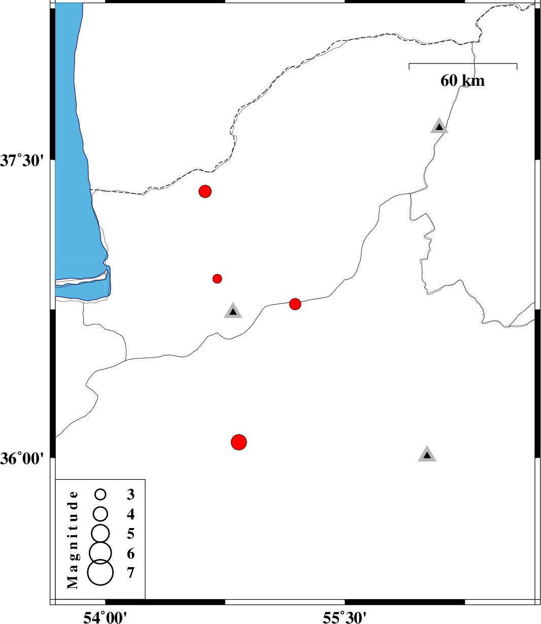 | 2018/07/11 | 04:29:59.2 | 08:59:59.2 | 37.341 | 54.625 | 14 | ML:3.5 | Golestan Province, 40 km North-East of Aq Qaleh | ||