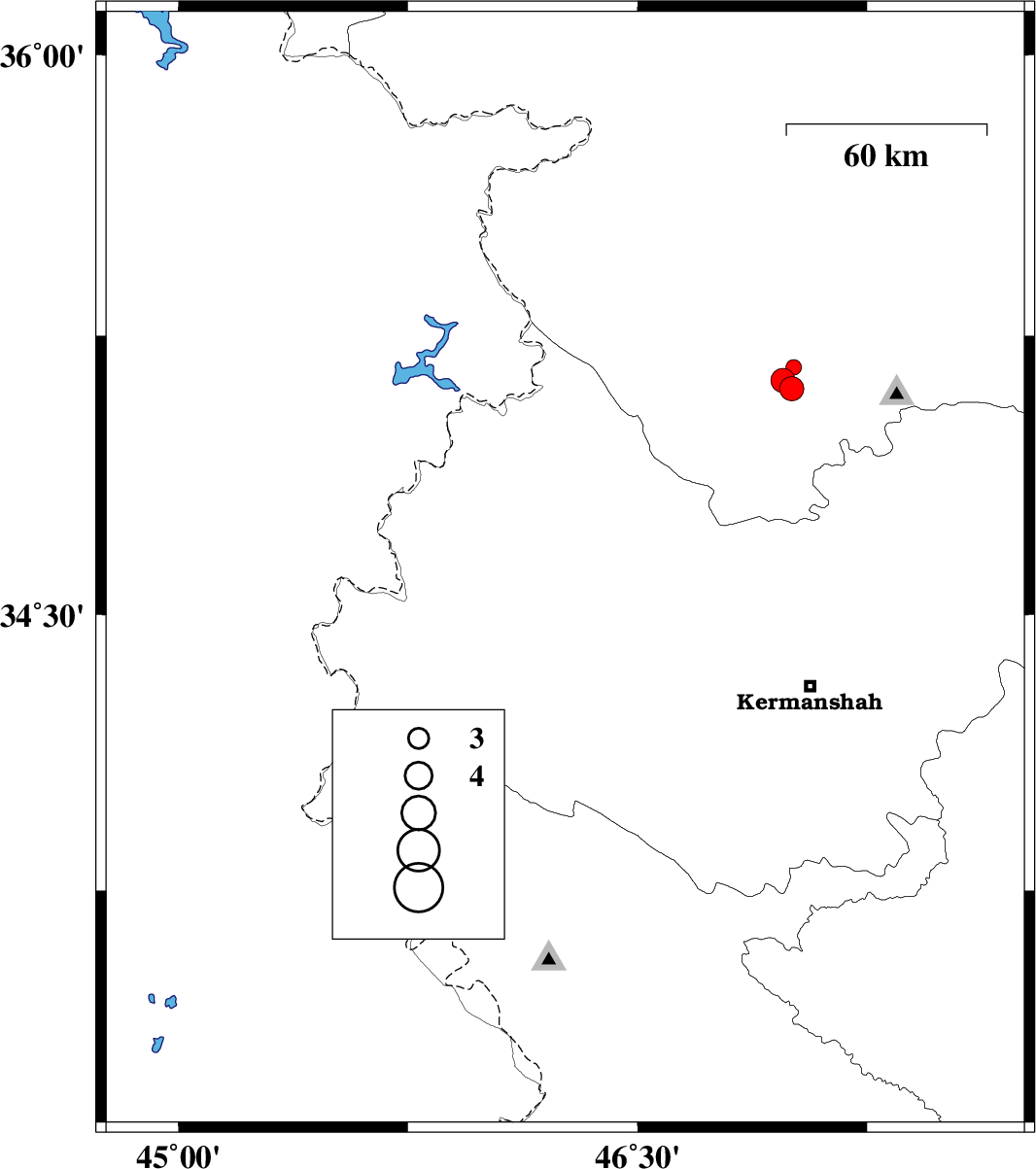 | 2018/08/01 | 03:00:26.8 | 07:30:26.8 | 34.674 | 46.271 | 6 | ML:2.3 | Kermanshah Province, 24 km South-West of Javanrud |