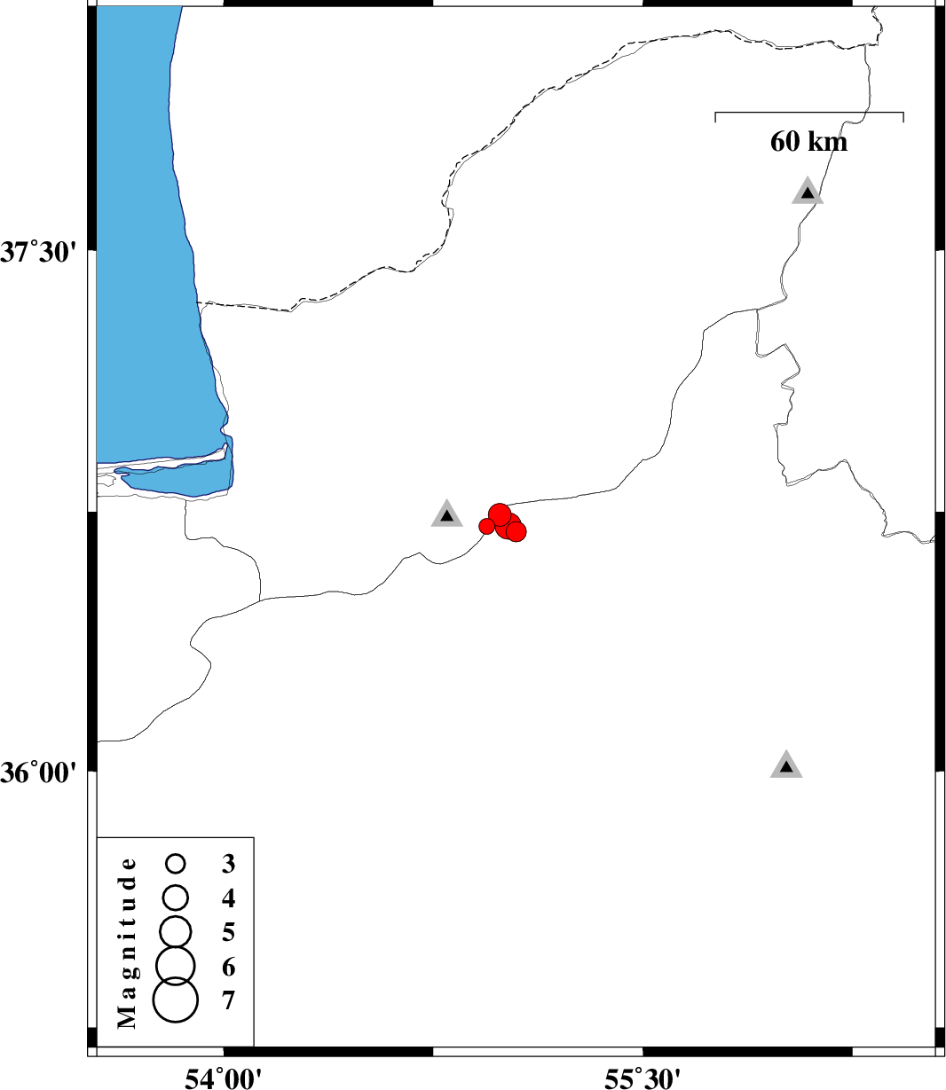 | 2018/08/12 | 00:04:52.6 | 04:34:52.6 | 36.708 | 54.942 | 15 | ML:2.6 | Golestan Province, 23 km South of Ali Abad | ||