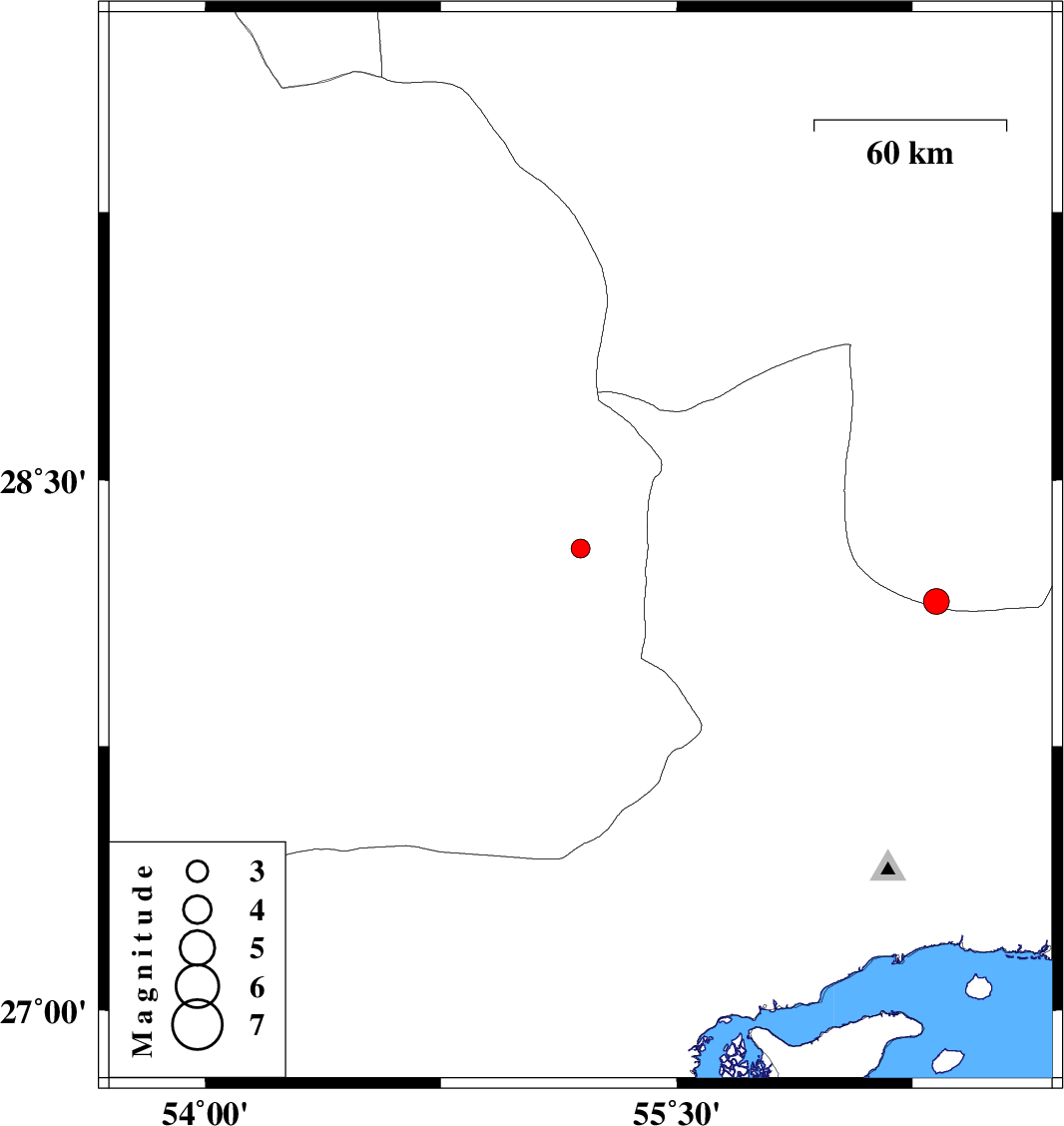 | 2018/08/11 | 12:09:46.5 | 16:39:46.5 | 28.159 | 56.326 | 18 | ML:3.6 | Kerman Province, 45 km South-East of Hajiabad |