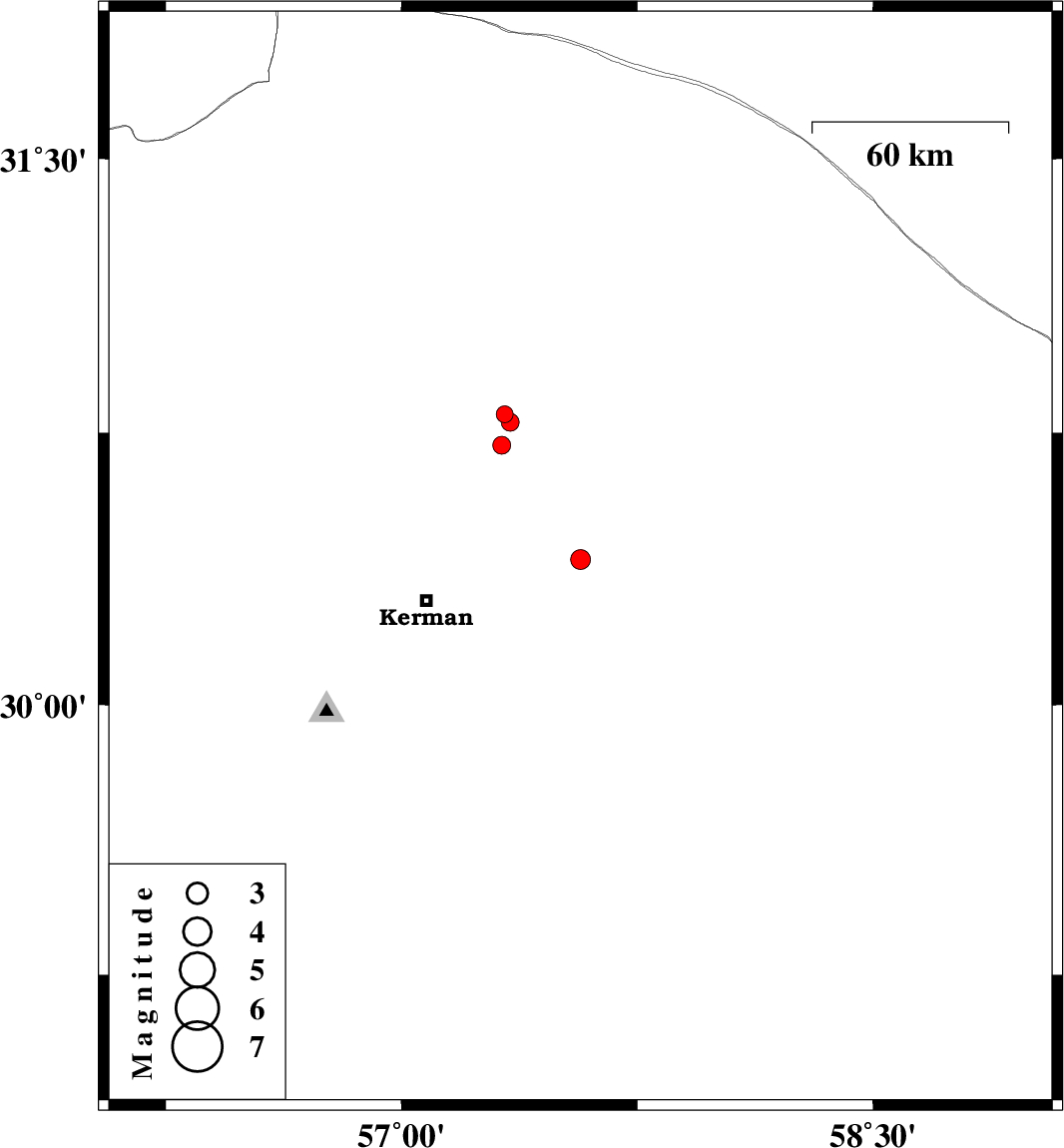 | 2018/08/15 | 06:58:16.5 | 11:28:16.5 | 30.401 | 57.569 | 14 | ML:2.8 | Kerman Province, 49 km North-East of Kerman | ||