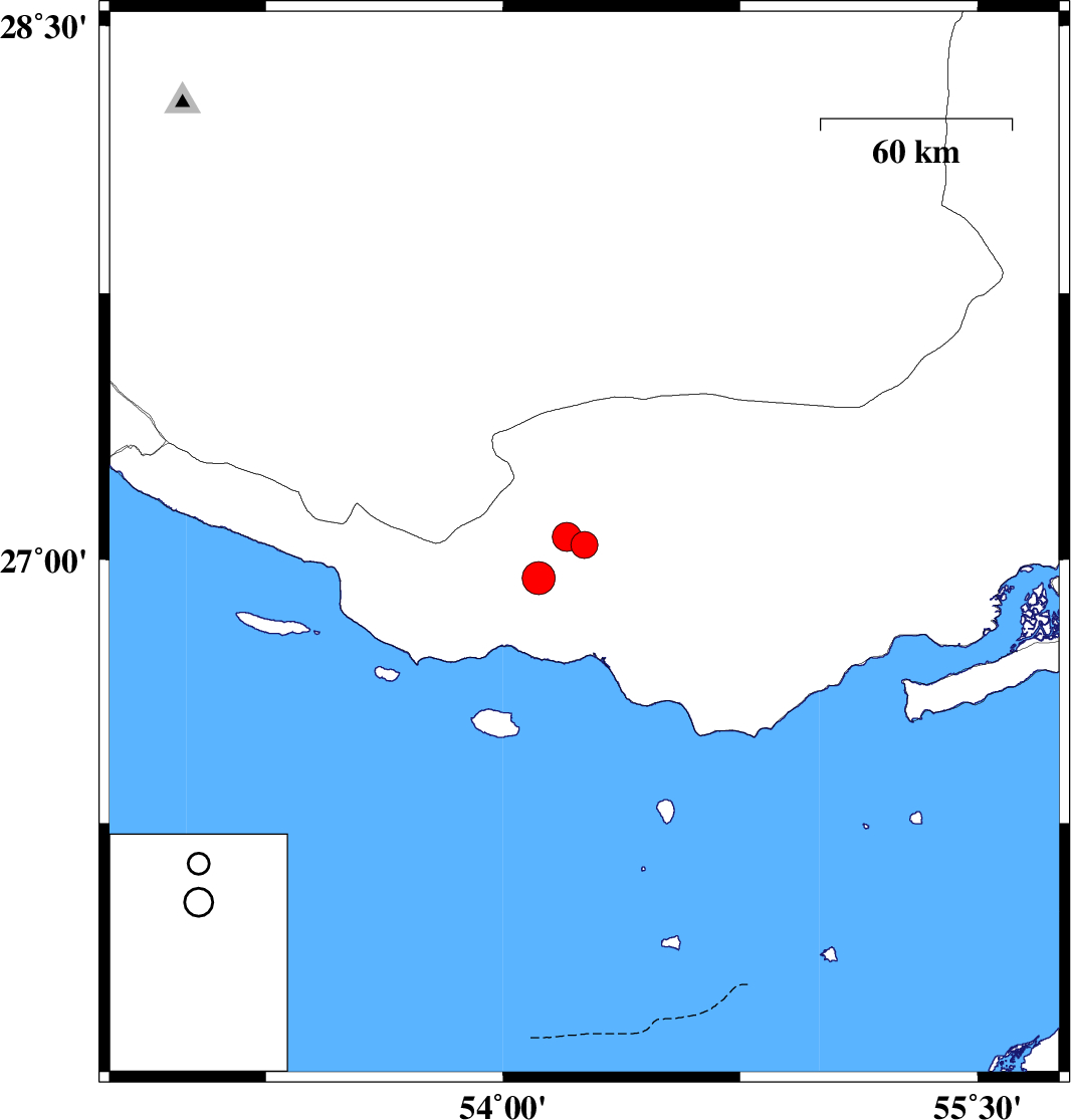 | 2018/08/24 | 18:18:42.8 | 22:48:42.8 | 27.041 | 54.257 | 15 | ML:3.8 | Hormozgan Province, 20 km South-West of Bastak | ||