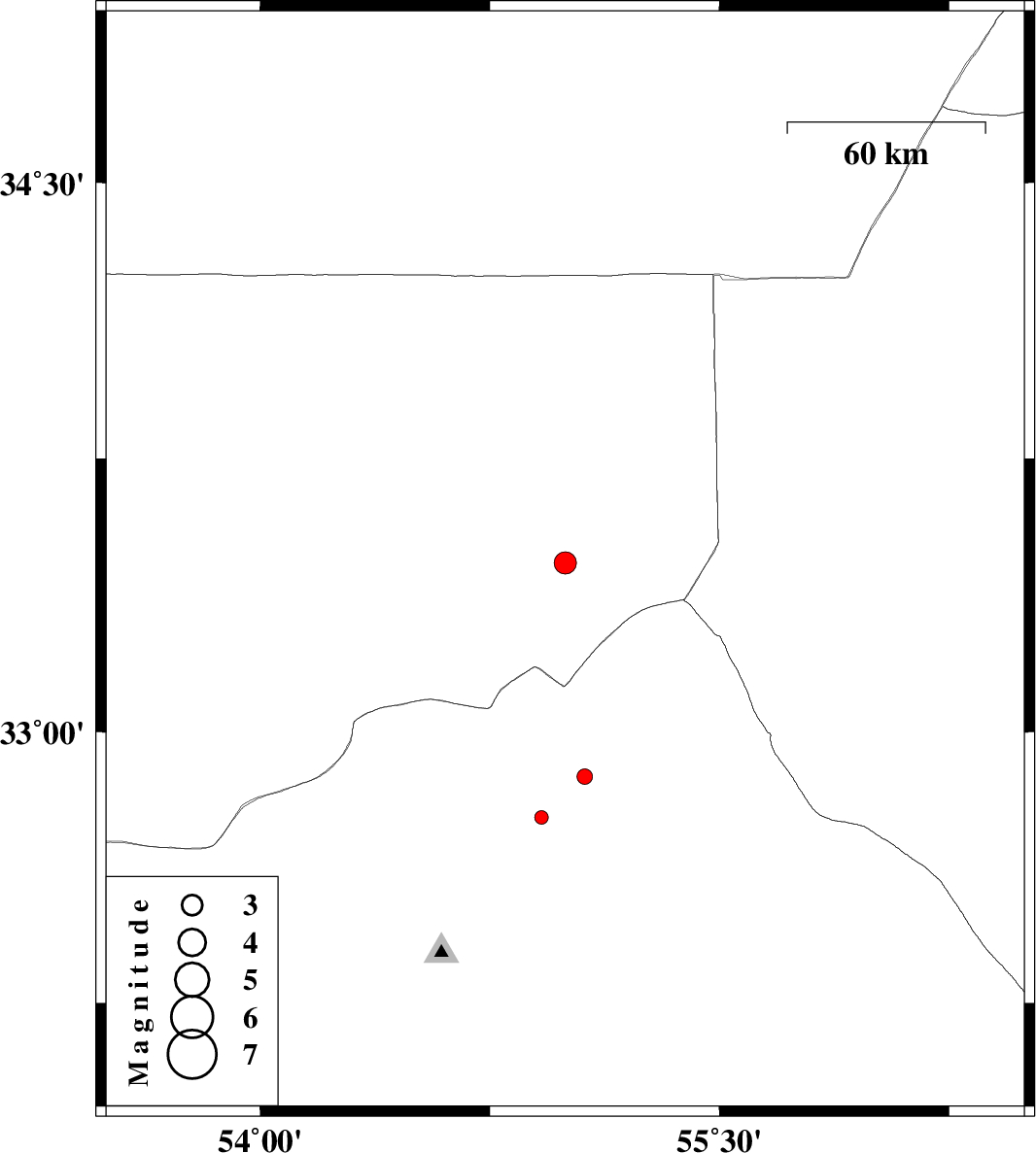 | 2018/09/01 | 21:12:24.4 | 01:42:24.4 | 33.464 | 54.996 | 14 | ML:3.3 | Esfahan Province, 180 km South-West of Tabas | ||