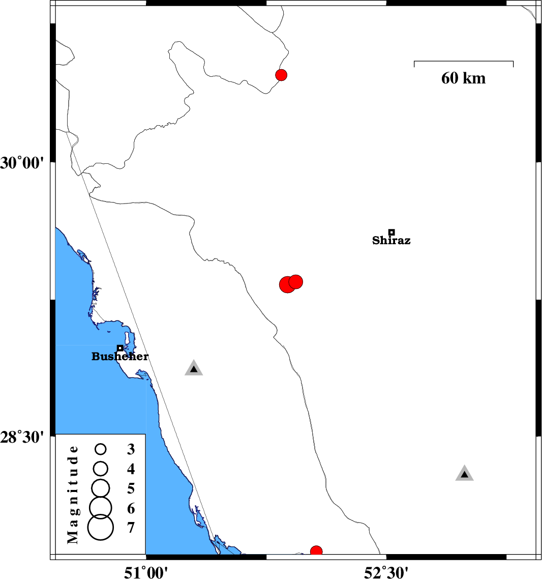 | 2018/09/23 | 05:22:56.6 | 08:52:56.6 | 29.332 | 51.882 | 15 | ML:4.7 | Fars Province, 39 km South-East of Kazerun | ||