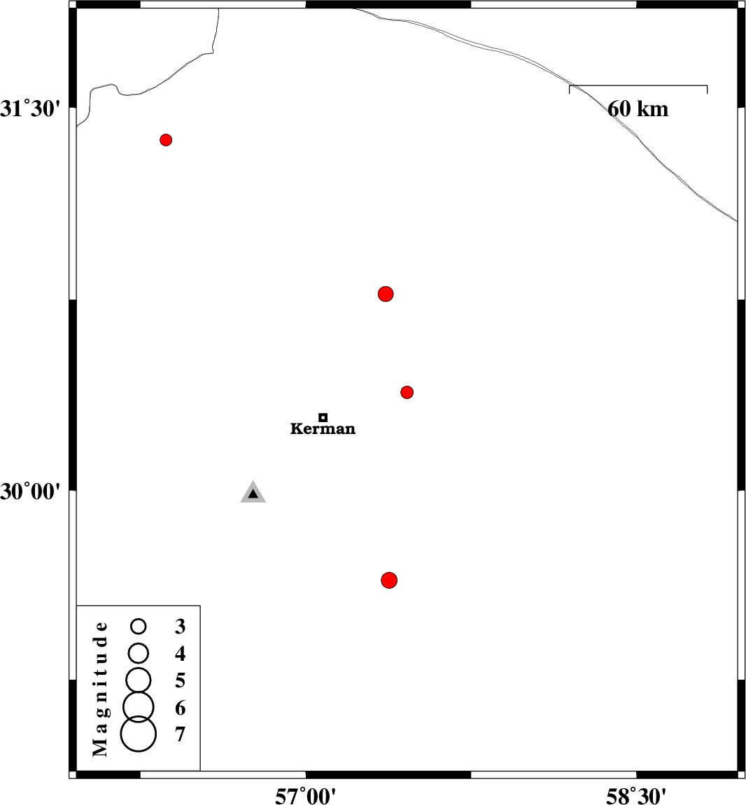 | 2018/09/21 | 00:33:47.3 | 05:03:47.3 | 30.773 | 57.363 | 14 | ML:3.1 | Kerman Province, 60 km North-East of Kerman | ||