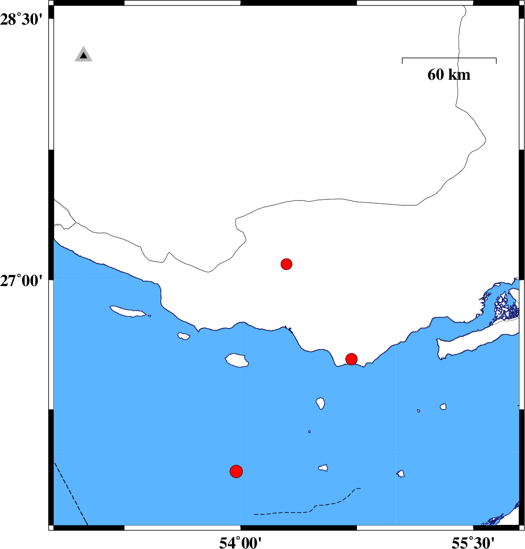 | 2018/09/29 | 09:08:17.2 | 12:38:17.2 | 27.075 | 54.295 | 15 | ML:3.6 | Hormozgan Province, 15 km South of Bastak | ||