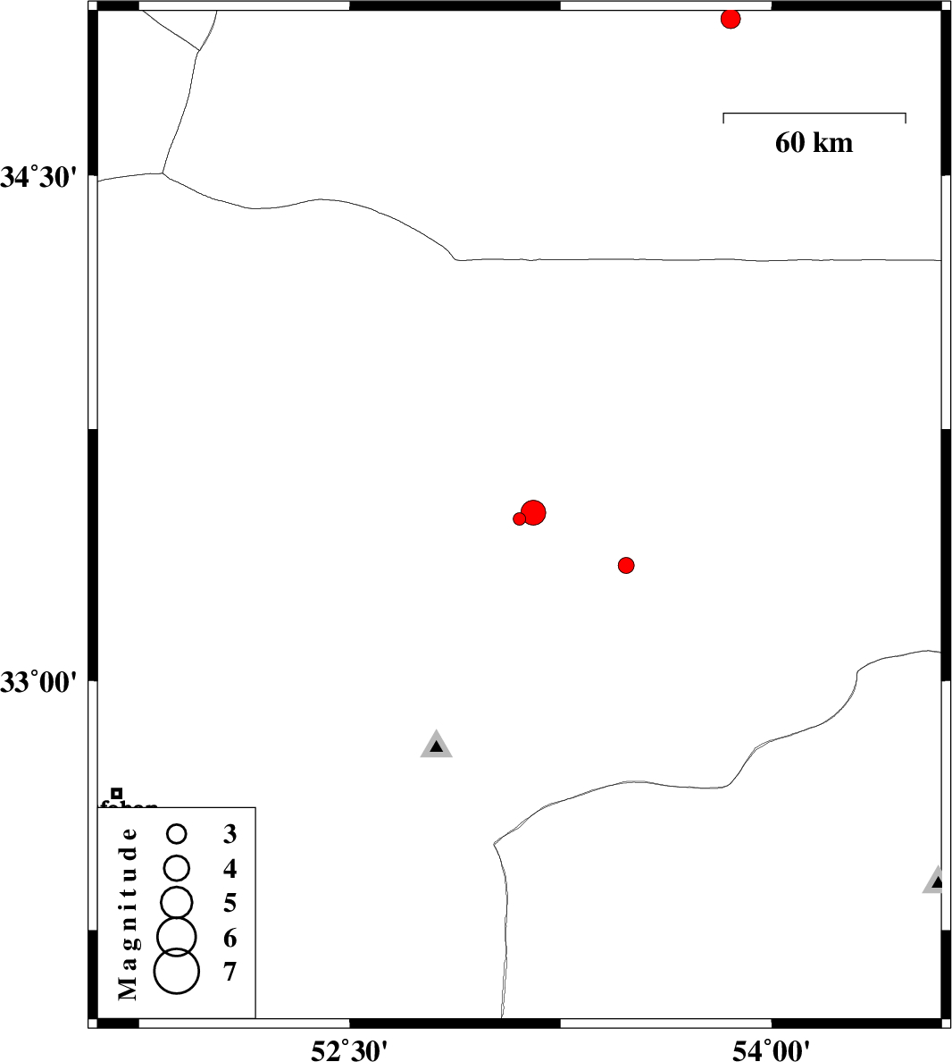 2018/09/30 | 03:24:29.5 | 06:54:29.5 | 33.344 | 53.482 | 14 | ML:2.5 | Esfahan Province, 64 km North-East of Nain | ||